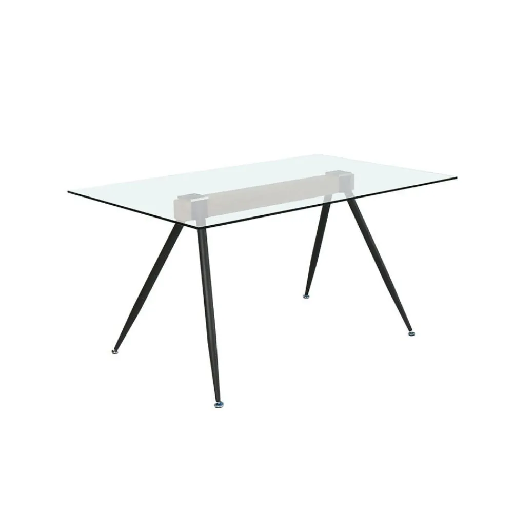 Con una resistente tapa de cristal templado de 10 mm de grosor, sujeta por debajo por un travesaño en color madera que une las dos patas metálicas en forma de triángulo, tenemos la mesa de comedor Oviedo, un diseño moderno adaptado a todo tipo de salones. Pueden comer cómodamente hasta seis personas