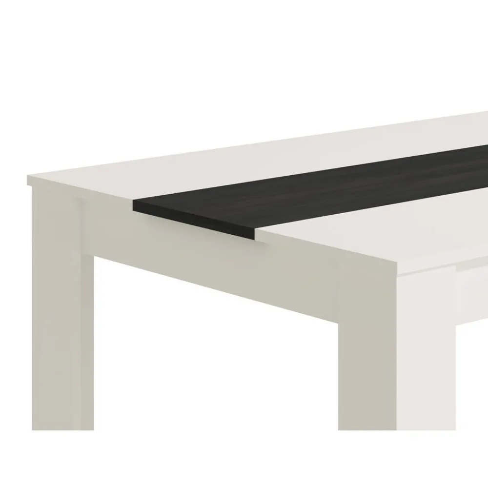 Mesa de comedor fija con encimera en MDF color Blanco con una franja central decorativa en negro y patas MDF en color roble Blanco. Una mesa elegante para tu salón.