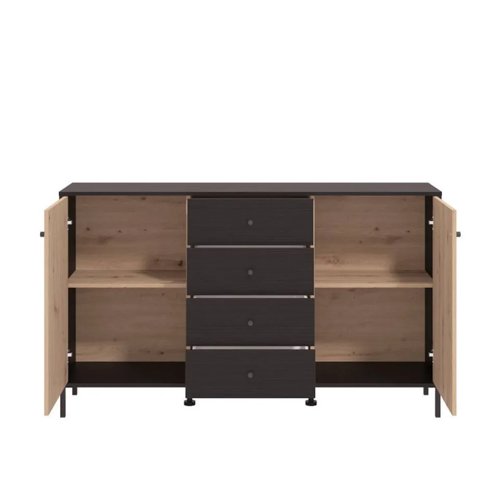 Este aparador cuenta con dos puertas laterales que esconden un estante interior, ideal para guardar vajilla, mantelería u otros objetos. En el módulo central, cuatro cajones ofrecen espacio adicional para almacenar de forma ordenada. Gracias a su robusta construcción en tablero de melamina, este mueble asegura durabilidad y resistencia.