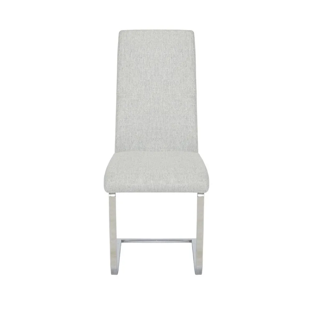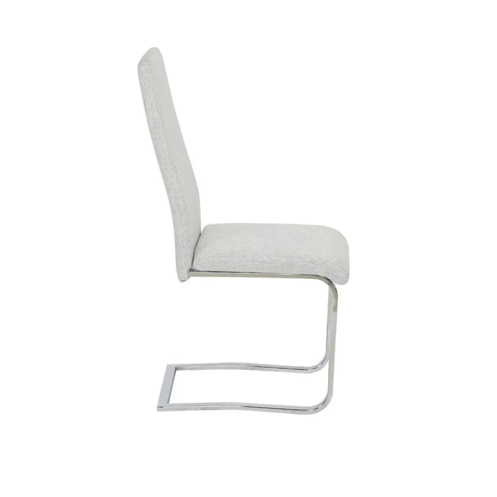 La silla para salón comedor Camila con asiento y respaldo acolchado y tapizado en tela color gris claro es una silla muy confortable. Combínala con la mesa de comedor que más te guste para completar tu salón. Patas metálicas en forma de U color cromo