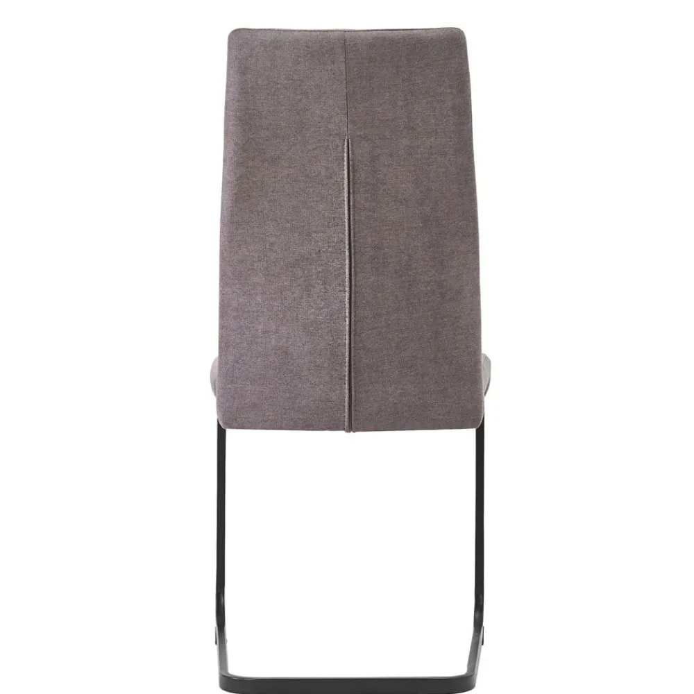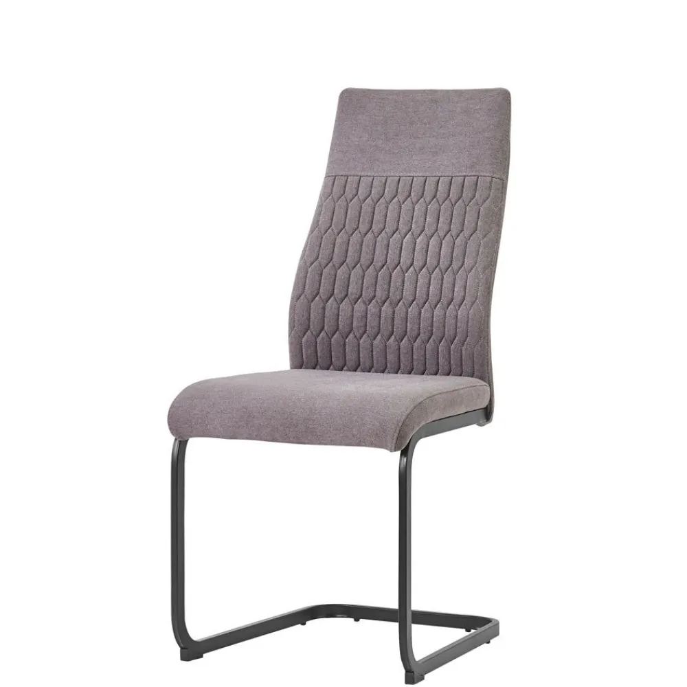 Silla de comedor con elegante diseño, asiento y respaldo fabricados en madera contrachapada, acolchados con espuma y tapizados en tela color gris. Parte delantera del respaldo decorada con bordado que Recuerda a un panal de abeja. Pata metálica tipo omega en color negro.