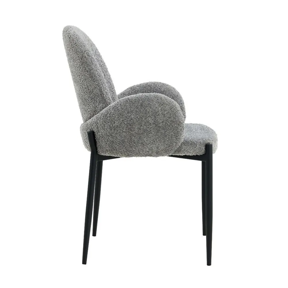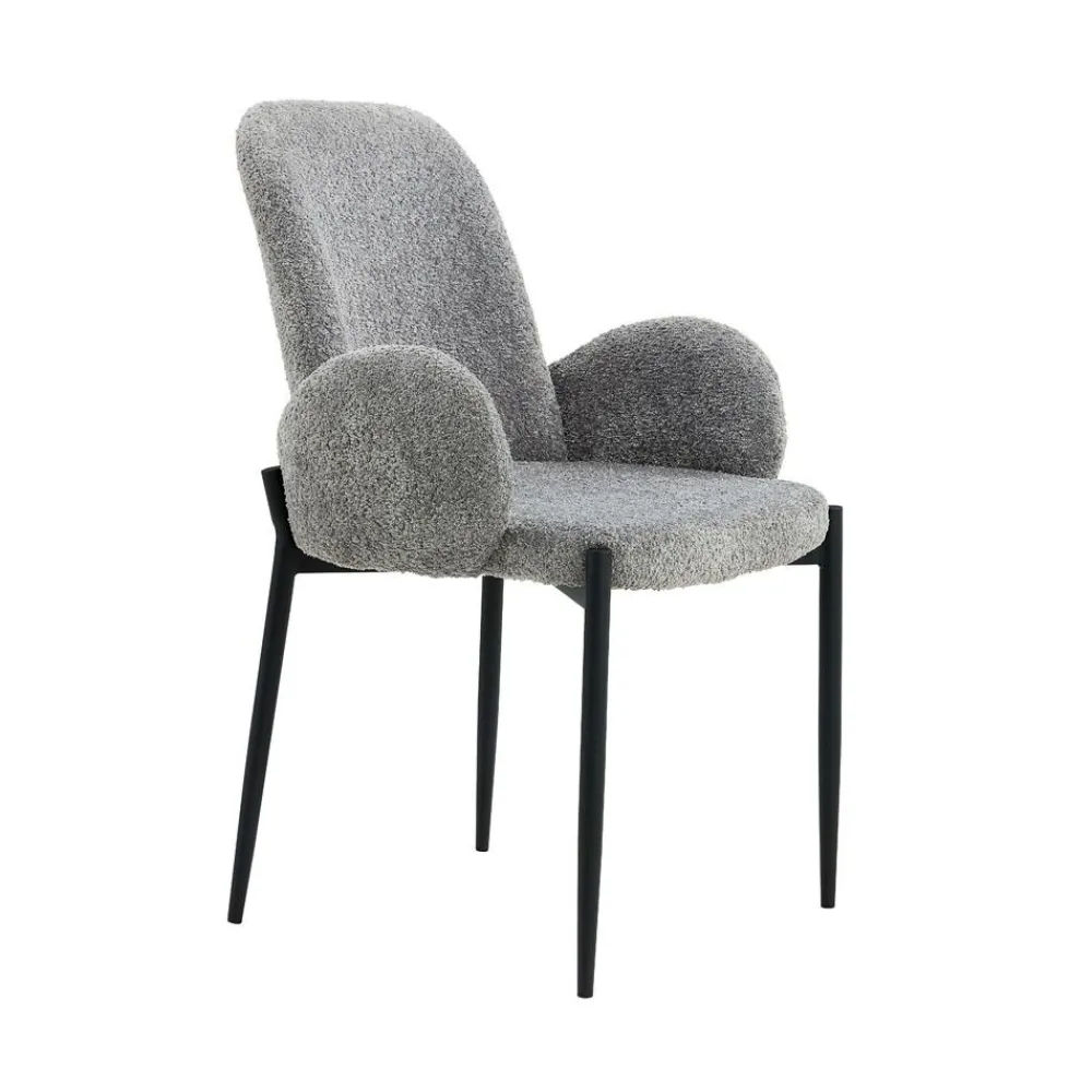Silla de salón con reposabrazos, acolchada y tapizada con una tela color gris tipo Teddy, que recuerda la textura de un osito de peluche. Destaca por la forma de sus patas metálicas en color negro.