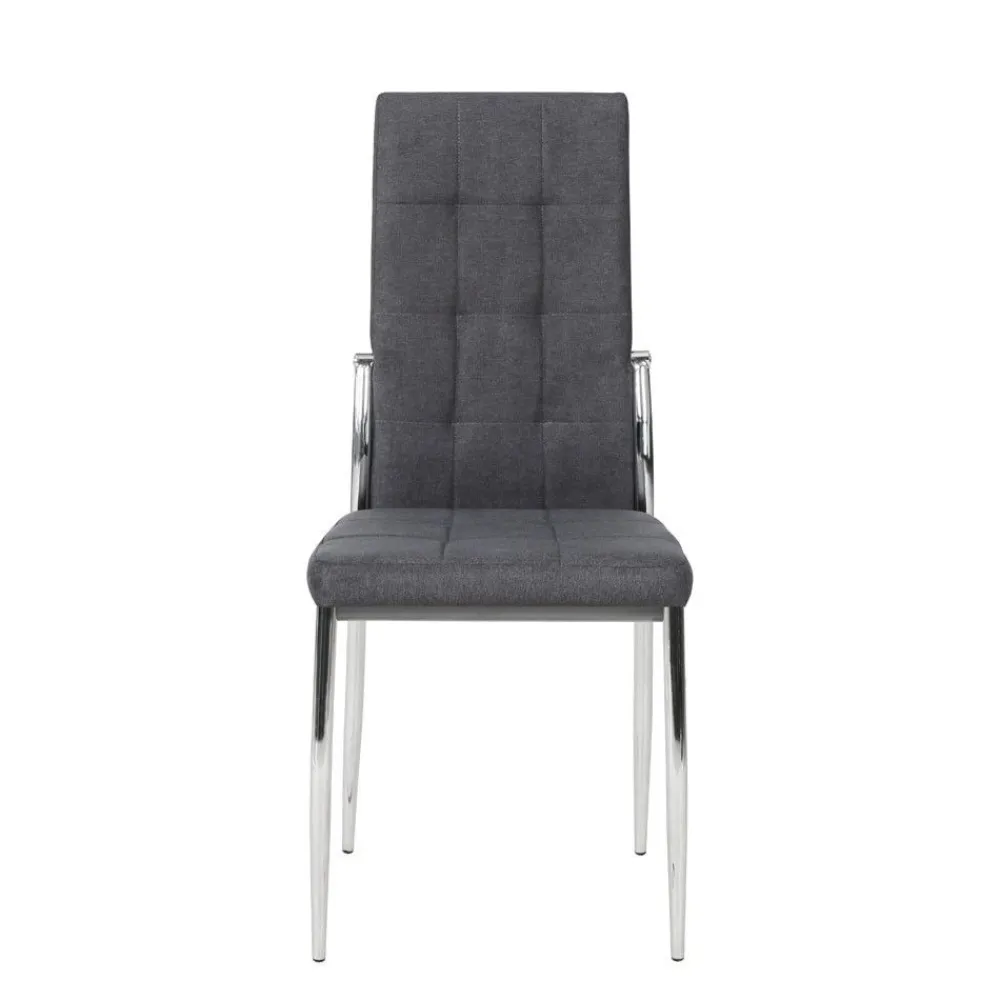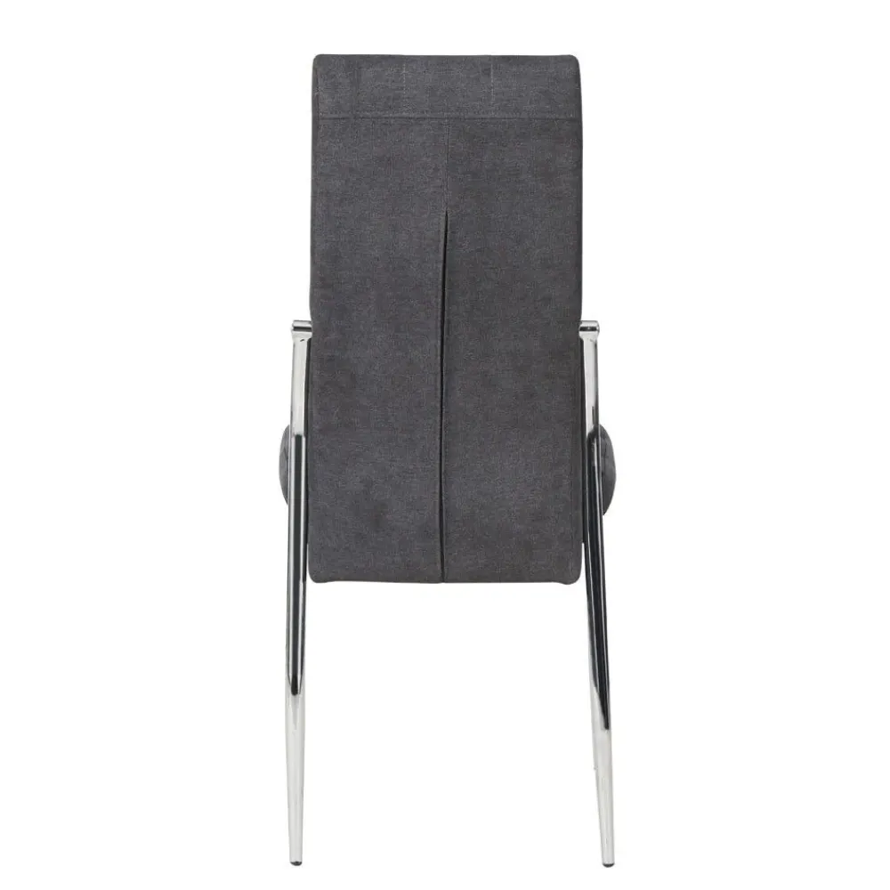 Silla de comedor tapizada en tela color gris y patas cromadas. Con asiento y respaldo acolchados.
