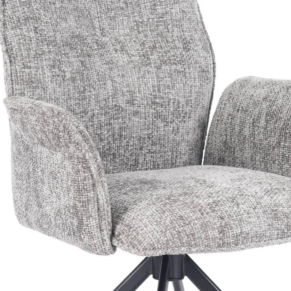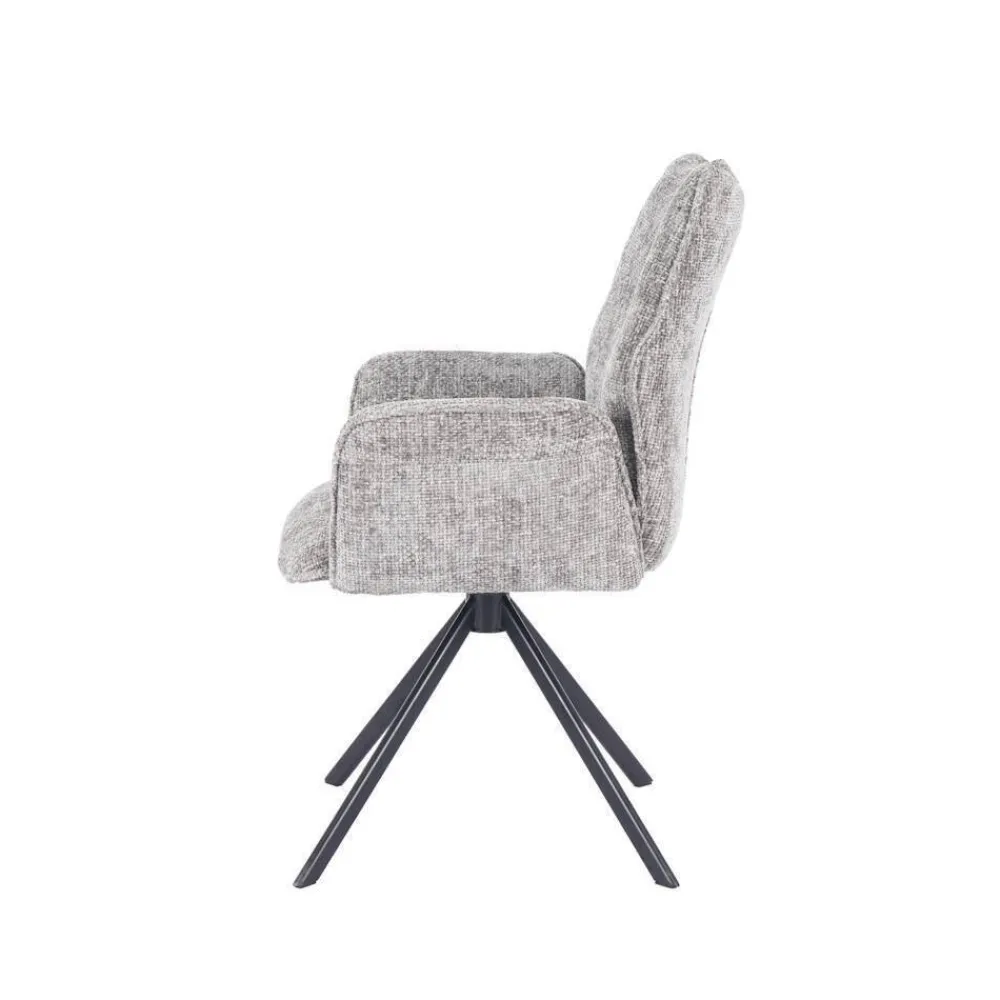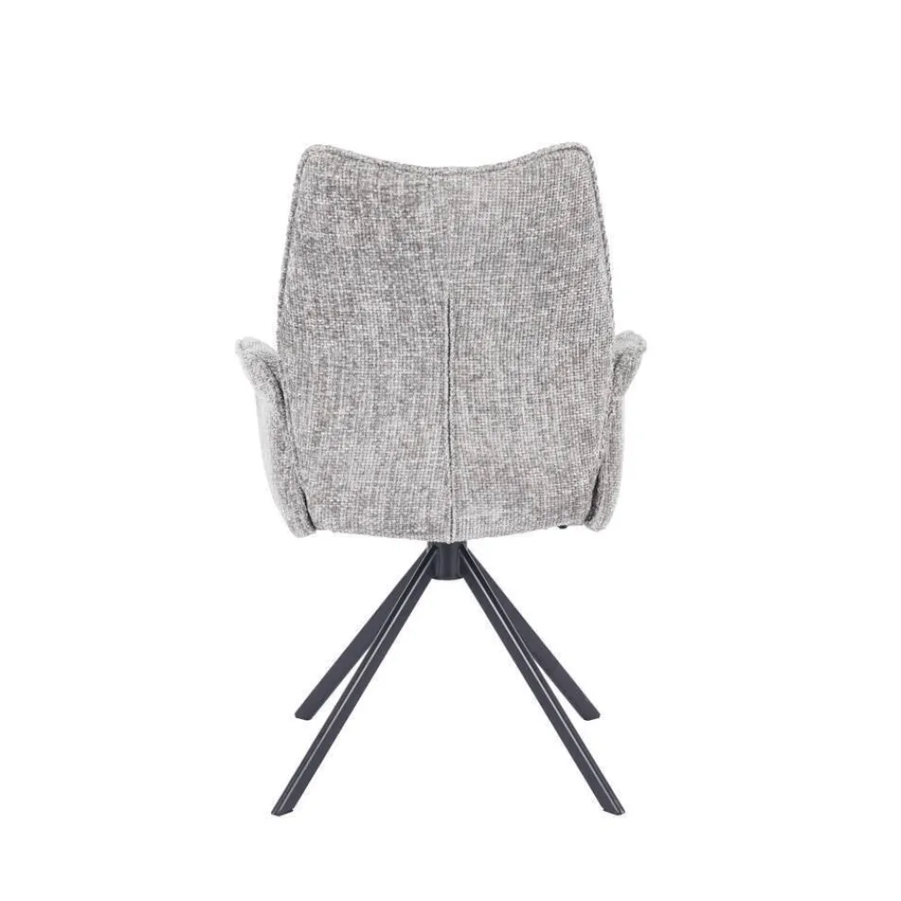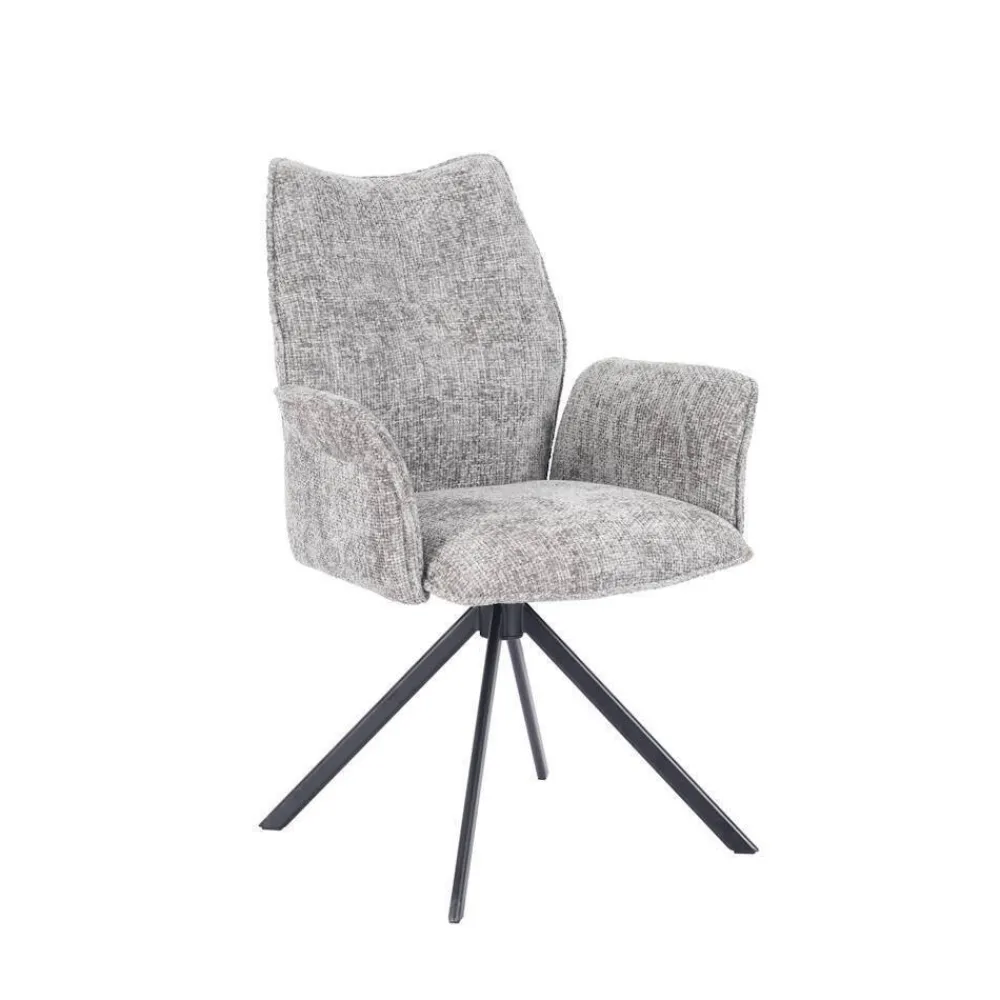 Su tapizado en tela de tono gris elegante y su diseño ergonómico con brazos, te ofrecen comodidad y estilo. Perfecta para un salón o comedor, cuenta con un mecanismo giratorio de 180º con retorno automático, ideal para espacios contemporáneos. Las patas metálicas negras aportan un toque de sofisticación