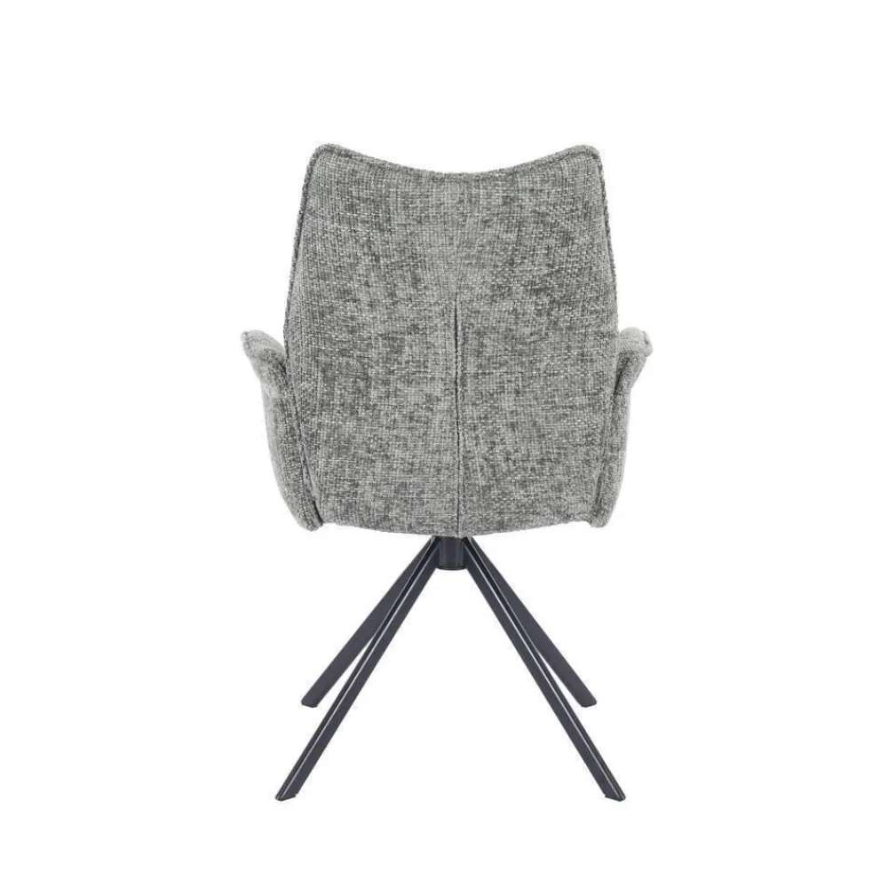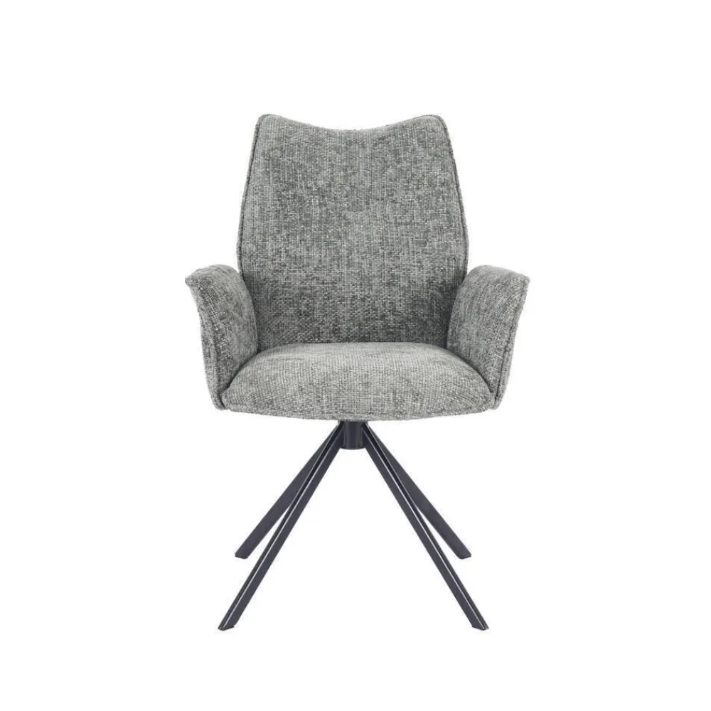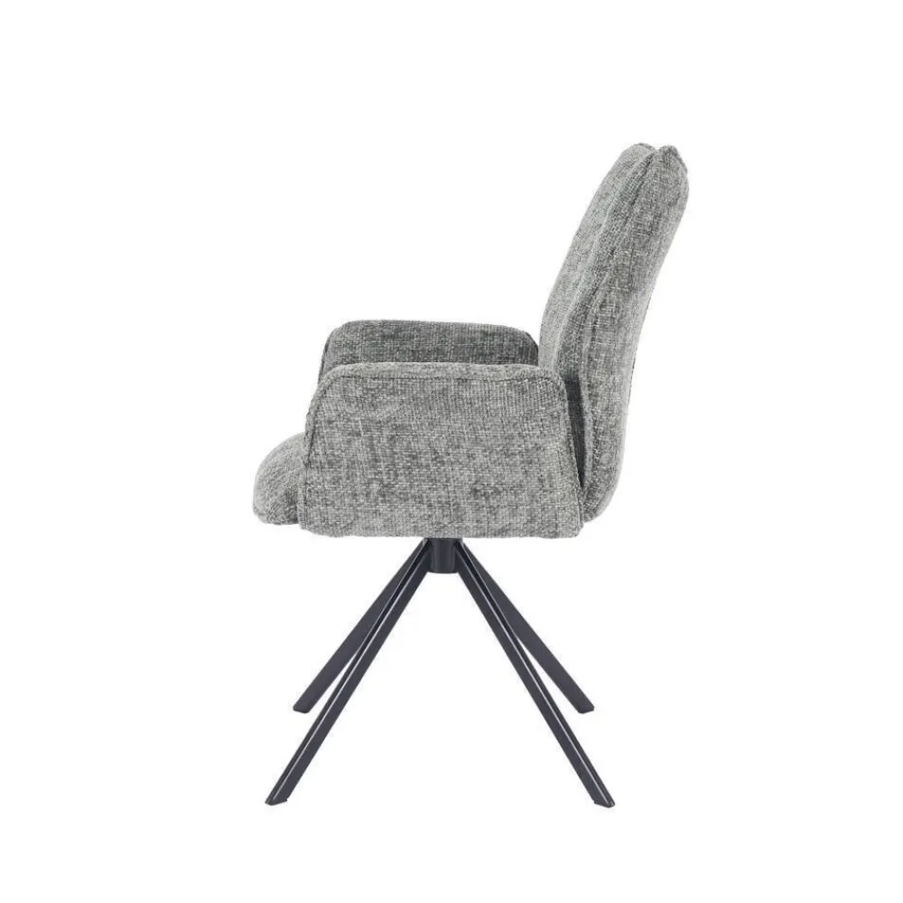 Su tapizado en tela de suave color musgo y su diseño ergonómico con brazos, te ofrecen comodidad y estilo. Perfecta para colocar en un salón o comedor, cuenta con un mecanismo giratorio de 180º con retorno automático, ideal para la vida moderna. Las patas metálicas negras aportan un toque de sofisticación a tu hogar.