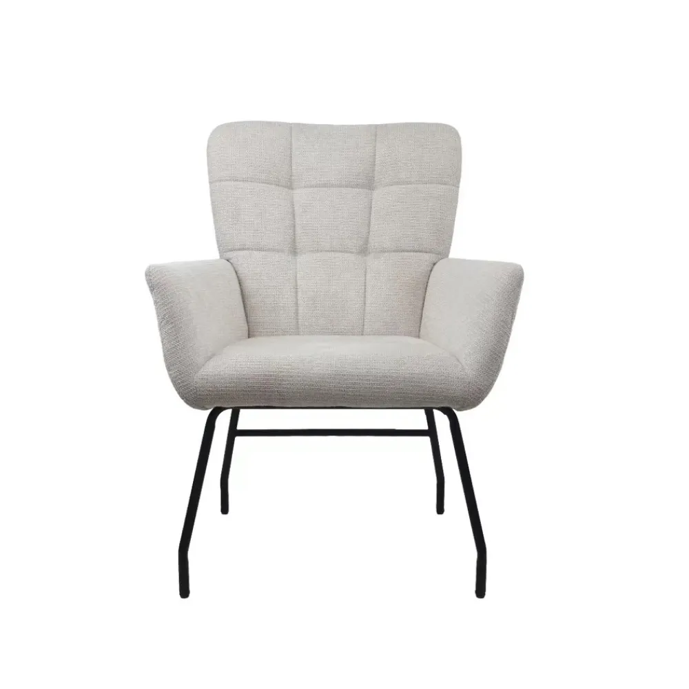 La butaca Olenka es una opción perfecta para quienes buscan un asiento cómodo y sofisticado en su hogar. Con un diseño moderno y elegante, esta butaca destaca por su estructura de madera y patas metálicas negras que aportan estabilidad y estilo. El tapizado en color beige, repelente al agua, asegura durabilidad y fácil mantenimiento. Es ideal para el salón, el dormitorio o cualquier rincón de tu casa.