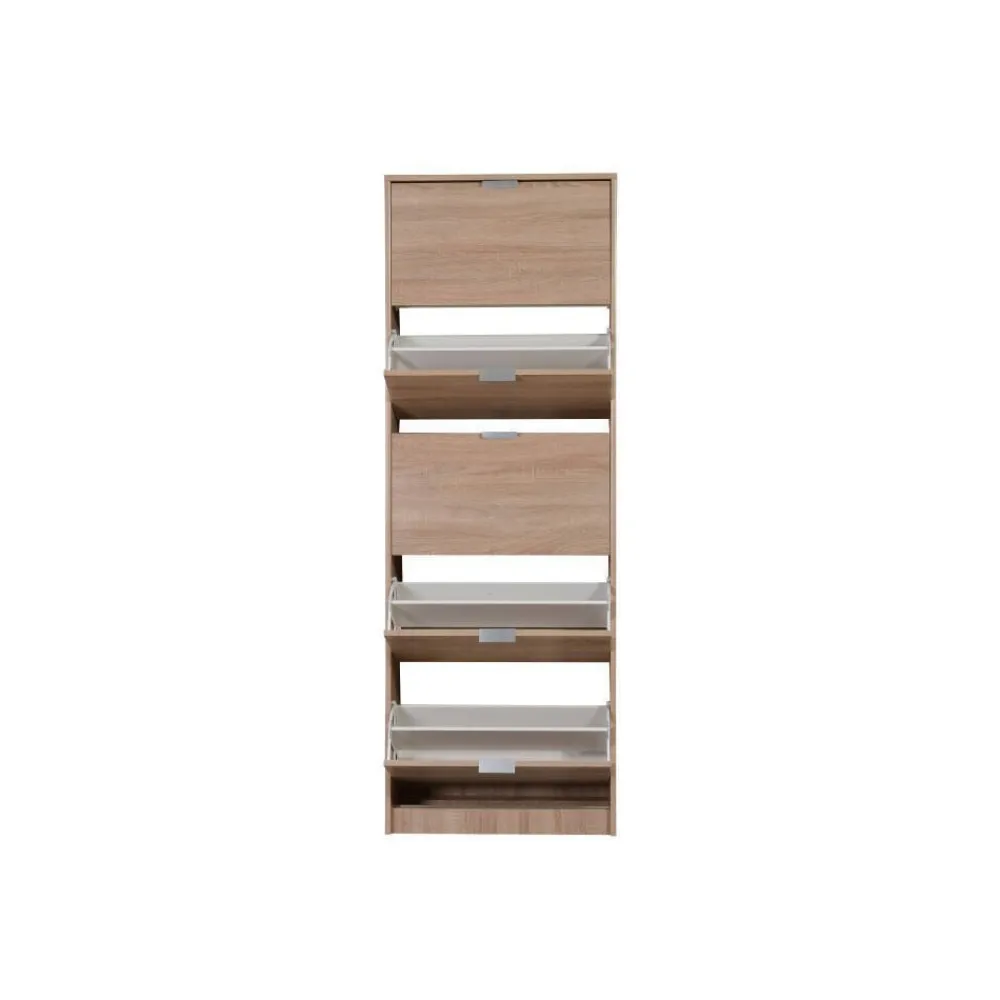 Zapatero de 5 puertas batientes en laminado sintético color roble Sonoma. Tiradores en color aluminio