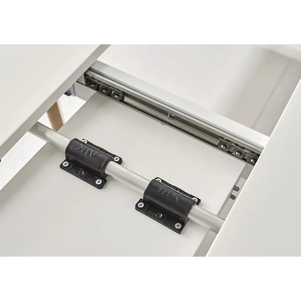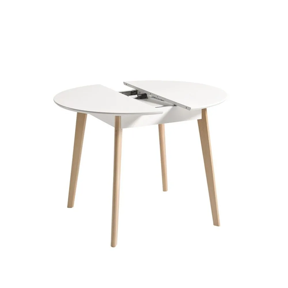 Una mesa redonda con un extensible central de 25 cm, que nos permite hacer más grande la mesa cuando lo necesitamos. Su armazón en color blanco y sus patas oblicuas de madera de haya en color natural, dotan a esta mesa extensible un acabado de estilo nórdico.