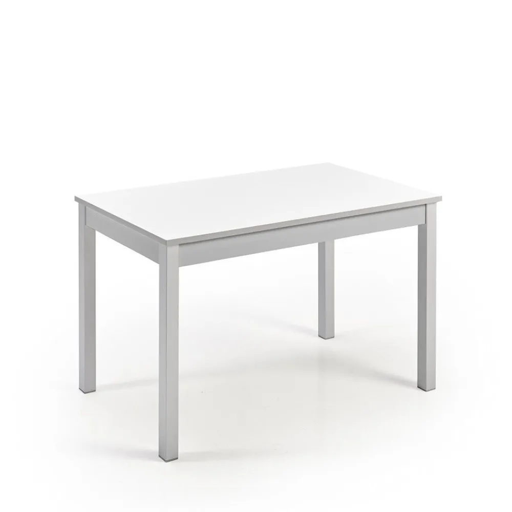 Una mesa de salón o una mesa de cocina, por su diseño moderno y minimalista, la puedes usar donde quieres. Disponible en dos tamaños, es una mesa resistente y duradera, con encimera en laminado blanco y armazón en laminado aluminio. Las patas son metálicas y puedes elegir su color entre aluminio y blanco texturizado.