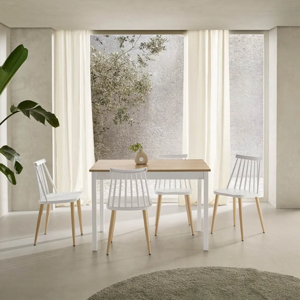 Una mesa que por su diseño cuidado, moderno con un marcado estilo escandinavo, puede ser utilizada tanto como o , la combinación de su encimera en laminado color roble con el armazón también fabricado en laminado color blanco y las patas metálicas en blanco texturizado, crean una mesa atemporal que se adapta a cualquier estilo de decorativo.
