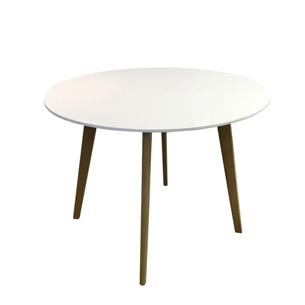 Una mesa de cocina redonda, de alta calidad, de marcado diseño nórdico por su presentación en color blanco y patas en madera de haya natural.