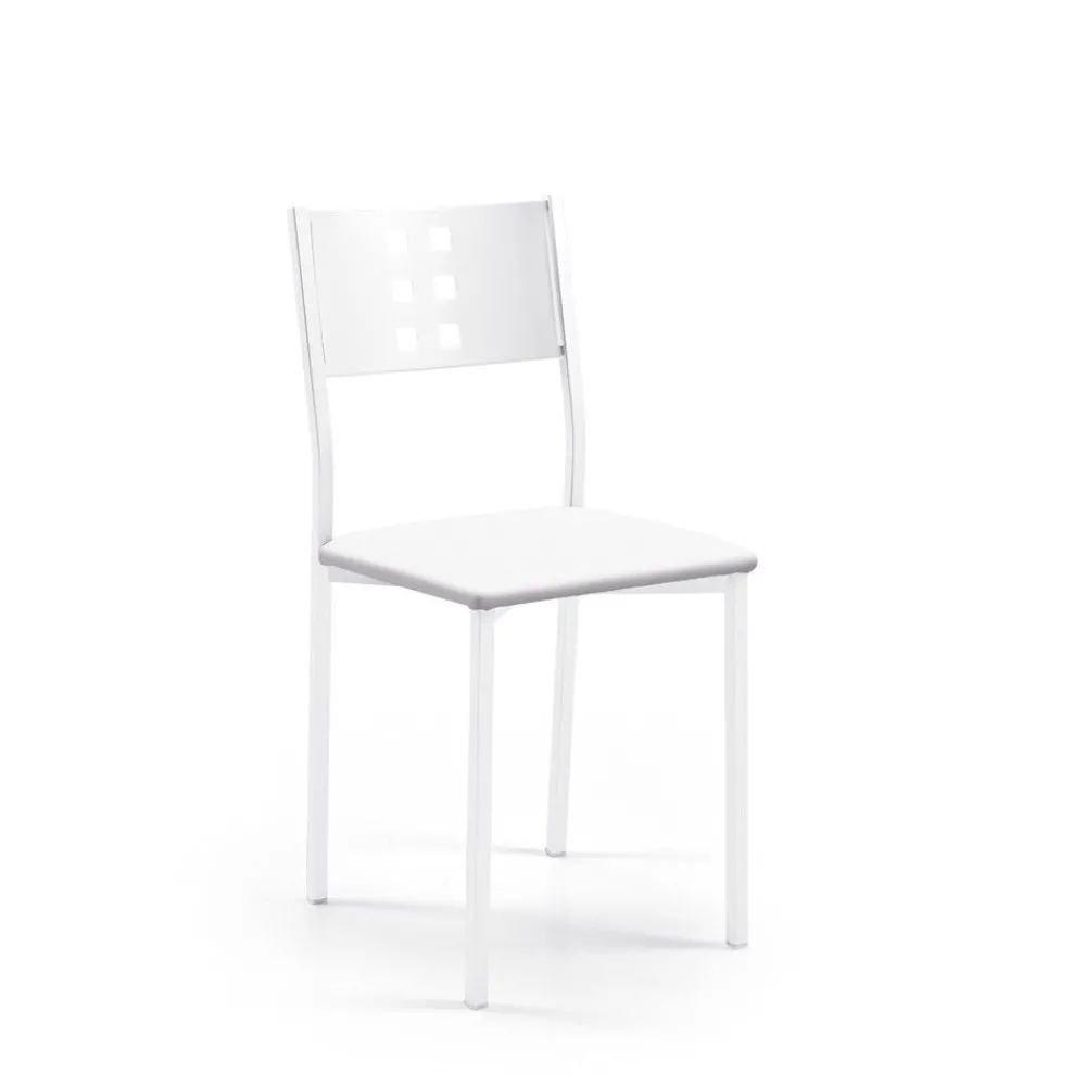 Las mejores sillas de cocina están En here, Zamora es una silla para cocina cómoda y con un amplio asiento cuadrado. De armazón metálico pintado en color blanco texturizado, destaca por la decoración de su respaldo con 6 cuadrados troquelados dispuestos en dos filas verticales. El asiento está acolchado y tapizado con posibilidad de elegir entre más de 20 colores.