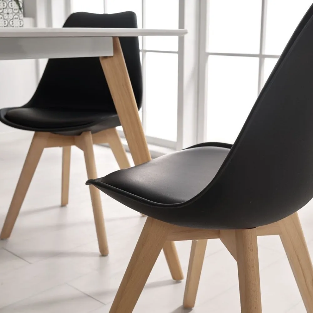 Tanto el asiento como el respaldo están fabricados en una sola pieza de polipropileno termoplástico de alta densidad en color blanco o negro, lo que les aporta mayor estabilidad y firmeza. El asiento además está tapizado en polipiel del mismo color para que la sentada sea mucho más mullida. Las patas son otro detalle a tener en cuenta, ya que están realizadas en madera de haya en color natural y son en forma de torre, combinan perfectamente para todo tipo de mesas de cocina o comedor de estilo nórdico e incluso para un escritorio.