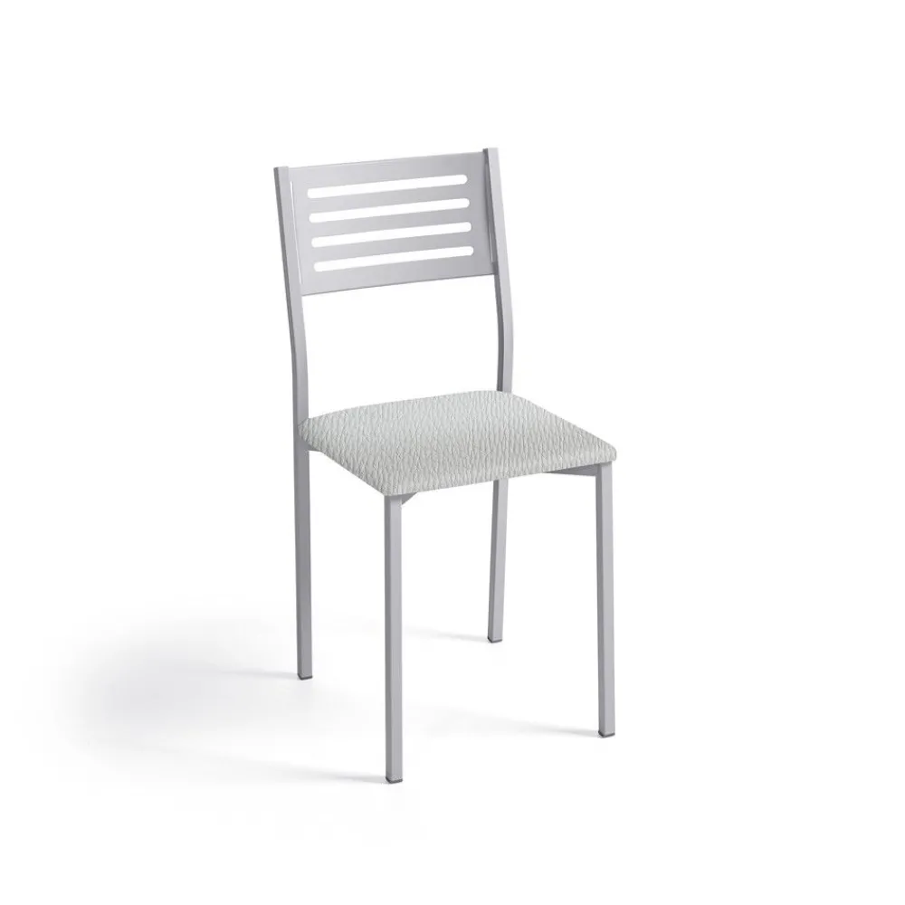 La silla de cocina Kati de estructura metálica pintada con pintura epoxi en color aluminio, tiene un asiento cuadrado acolchado y tapizado en polipiel. En here puedes elegir entre varios tapizados, para que encuentres el que mejor se adapte a la decoración de tu casa.