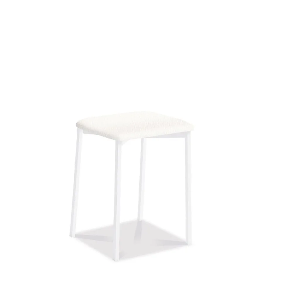 El taburete de cocina Kati de estructura metálica pintada con pintura en color blanco texturizado, tiene un asiento cuadrado acolchado y puedes elegir entre más de 20 tapizados.