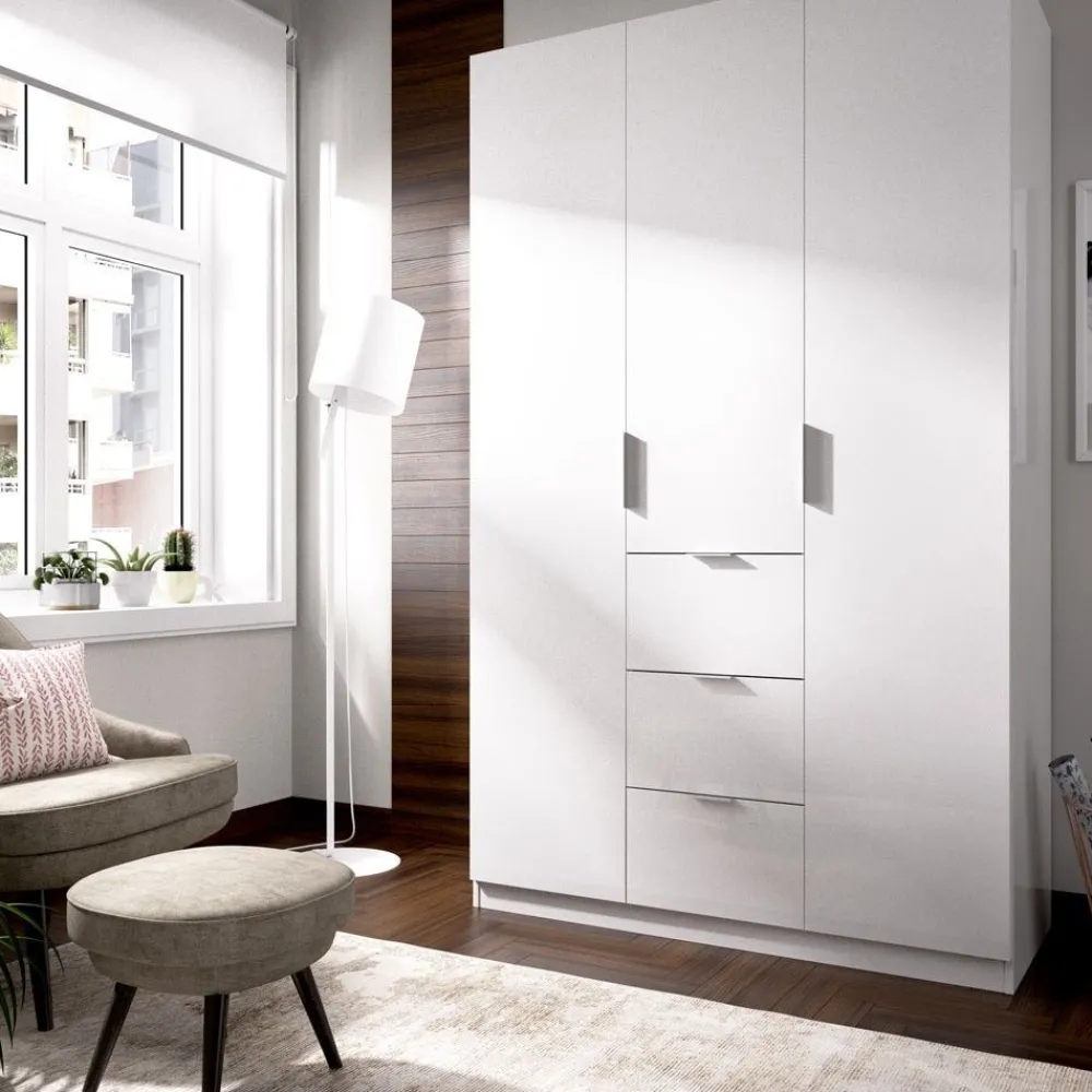 El Armario Essen de 3 puertas y 3 cajones en color blanco brillo, es ideal para dormitorios pequeños gracias a su fondo reducido y gran capacidad de almacenamiento. Su diseño elegante y moderno se adapta a cualquier estilo de decoración, proporcionando una solución práctica para organizar tu ropa.