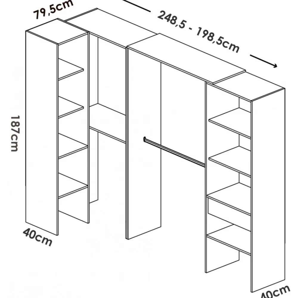 - Armario rincón sin puertas: 198 – 248 cm (ancho) x 187 cm (alto) x 80 cm (fondo)