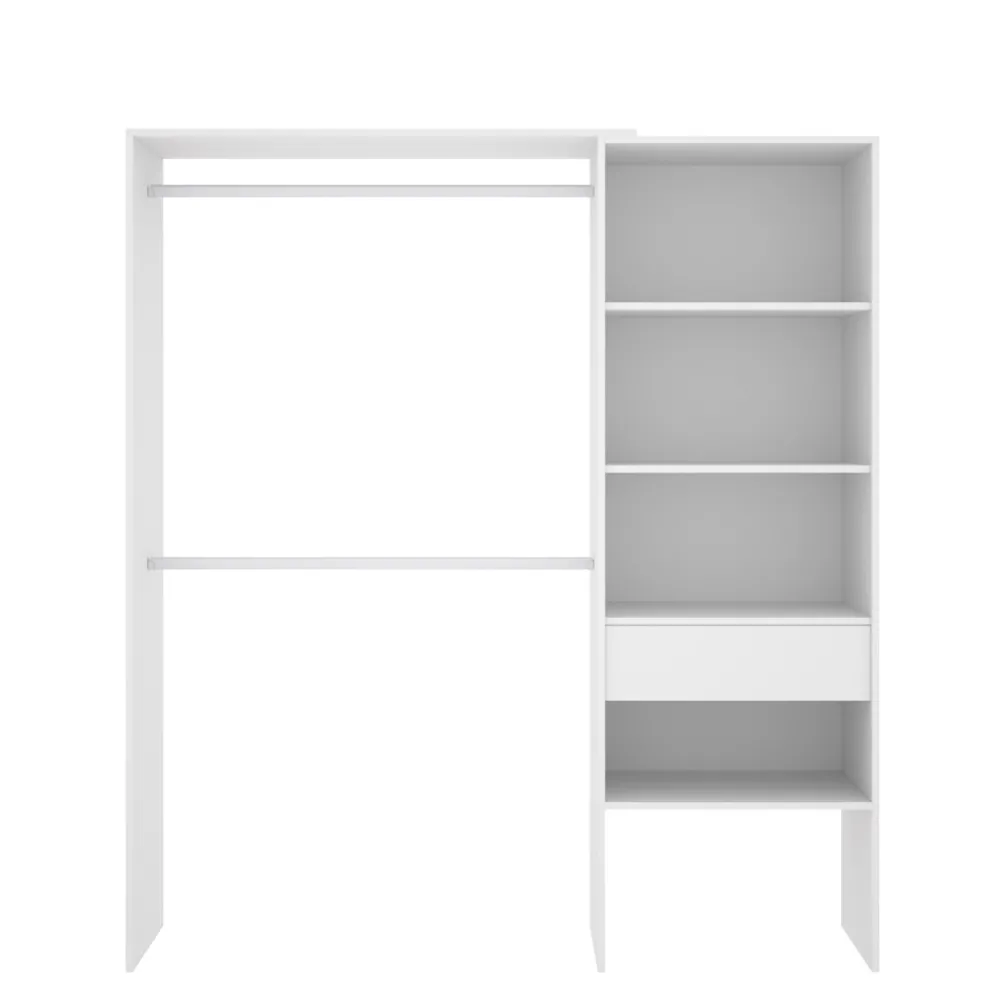 Armario vestidor de 110-160 cm de ancho en color blanco con un cajón y múltiples huecos de almacenamiento, perfecto para optimizar el espacio en tu dormitorio.