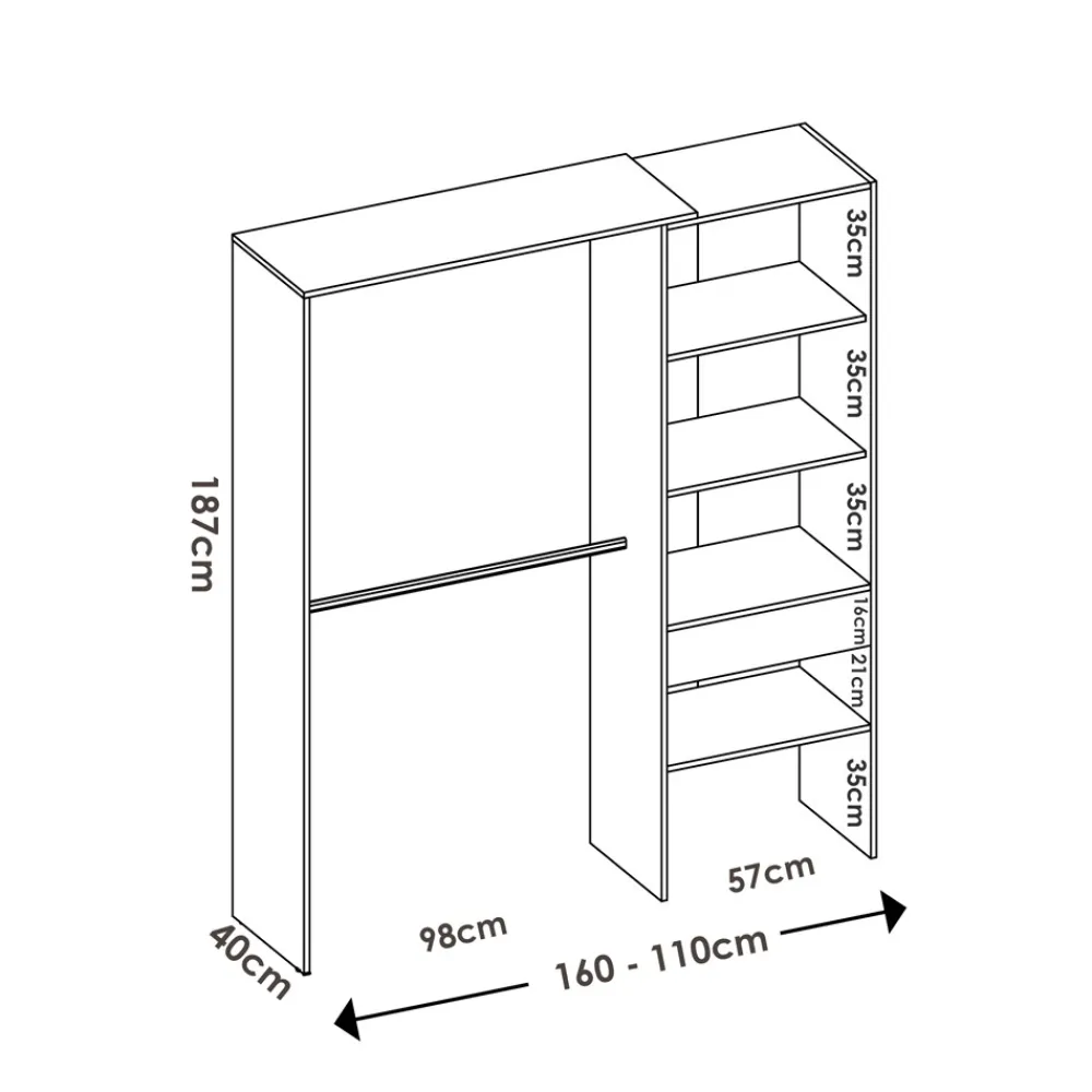 El es ideal para aquellos que buscan funcionalidad y estilo en su dormitorio. Este armario, adaptable a una anchura de 110 cm a 160 cm, ofrece una solución versátil y personalizada para tu espacio.
