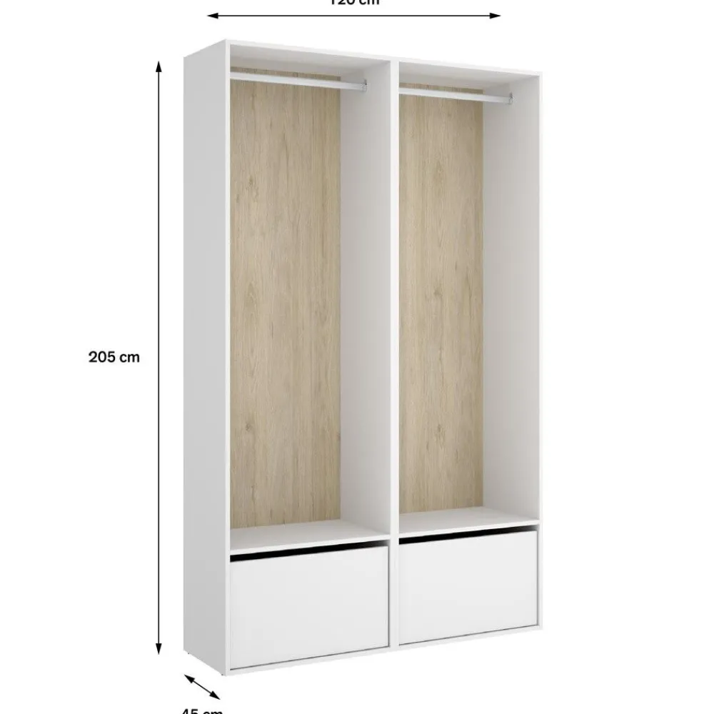 El es la mejor solución para quienes buscan tener su ropa bien ordenada y mantener la estética en un solo mueble. Se trata de un armario sin puertas de 120 cm de ancho, este vestidor se compone de dos módulos de 60 cm, ofreciendo una doble zona de almacenaje que maximiza el espacio de tu habitación. La parte superior incluye una barra de colgar de aluminio, perfecta para colgar ropa de forma organizada. En la parte inferior, cada uno de los módulos tiene un práctico zapatero con puerta abatible y estantes interiores permite ubicar calzado de gran tamaño.