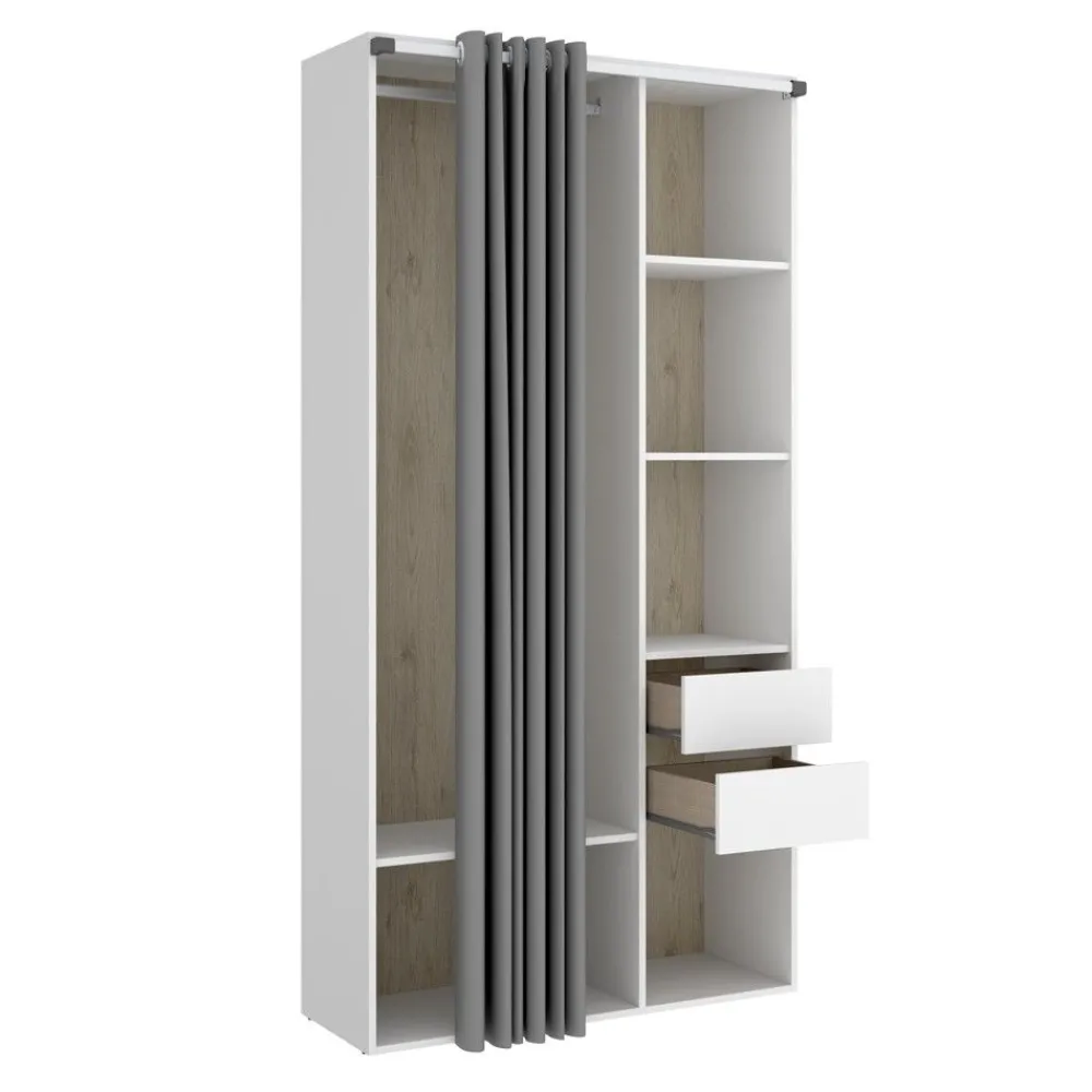 Armario vestidor de 98 cm ancho en color blanco con trasera reversible en color blanco y roble Natural, con una barra para colgar, 4 estantes y dos cajones. Incluye cortina para tapar y proteger la ropa.