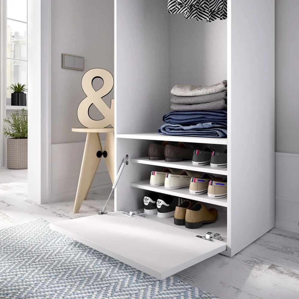 El es la opción perfecta para optimizar el espacio en cualquier dormitorio. Este armario vestidor abierto de 60 cm de ancho ofrece una solución práctica y elegante, con doble zona de almacenamiento para mantener todo organizado. En la parte superior, cuenta con una barra de colgar de aluminio, ideal para colgar pantalones, vestidos o camisas, mientras que en la parte inferior dispone de un práctico zapatero con puerta abatible y estantes interiores para calzado de gran tamaño.