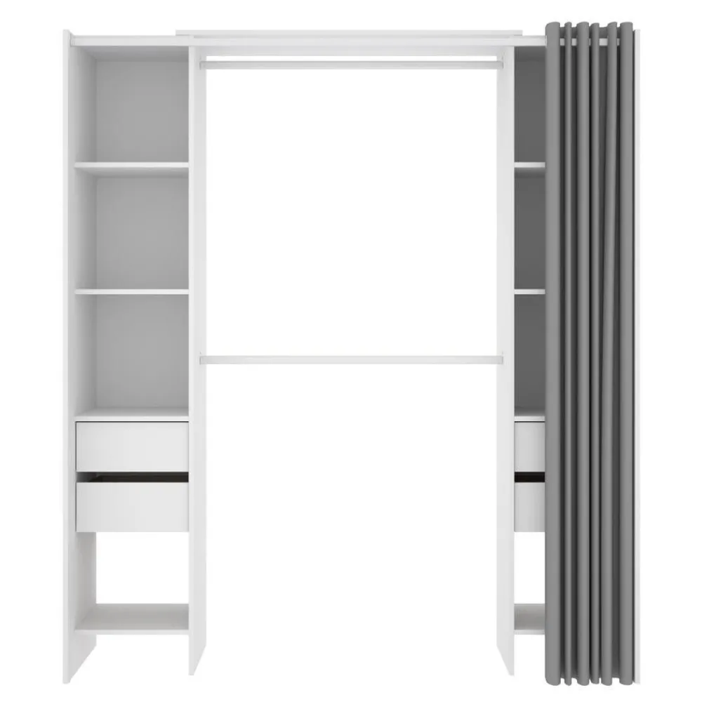 Vestidor blanco con mucha capacidad de almacenaje compuesto por dos laterales, unidos por la barra de colgar, con estantes y dos cajones en cada uno de ellos. Dispone de una cortina para proteger toda tu ropa