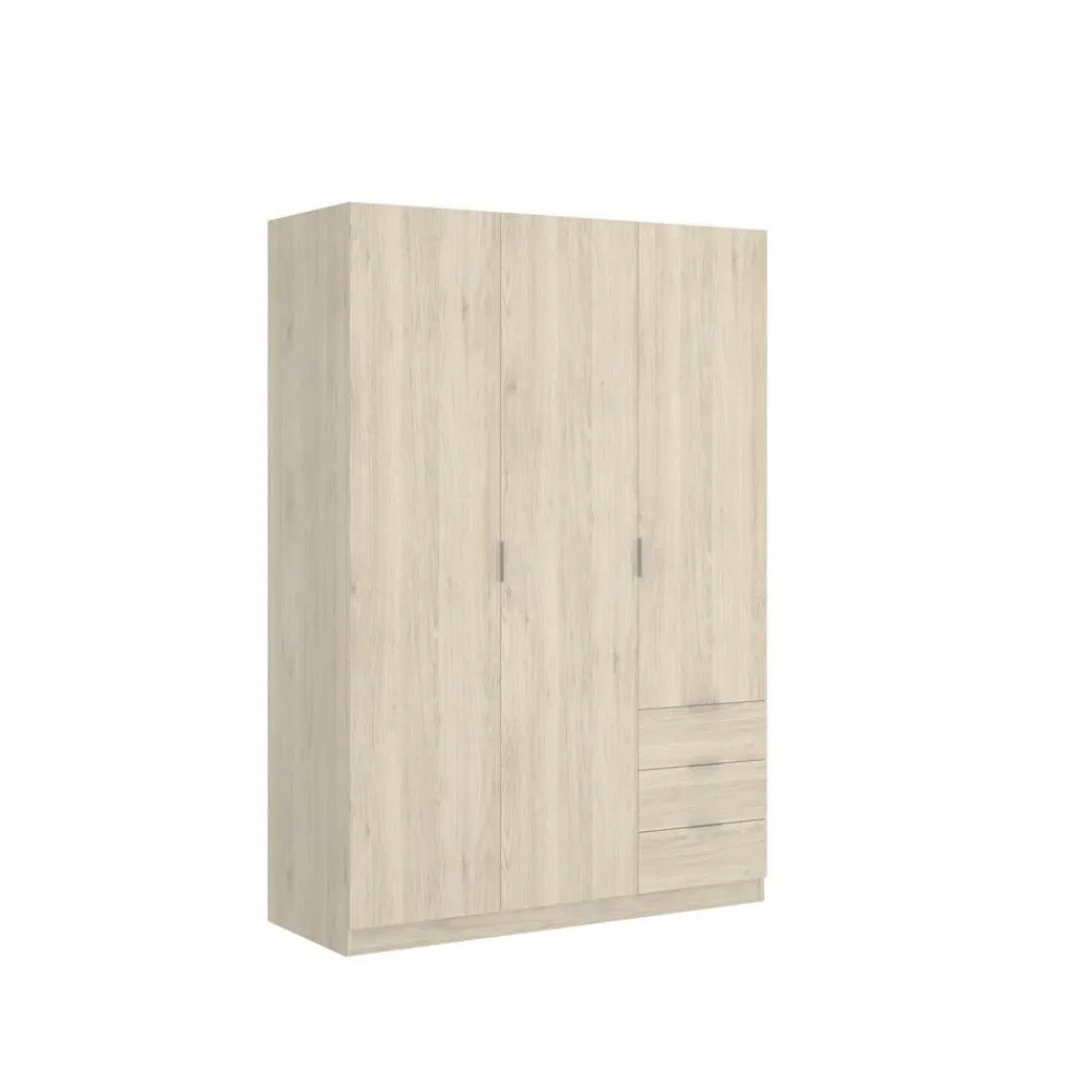 El en color roble natural es la solución perfecta para quienes necesitan optimizar el espacio en su dormitorio. Este elegante mueble cuenta con tres puertas y tres cajones, proporcionando un almacenamiento versátil y amplio.