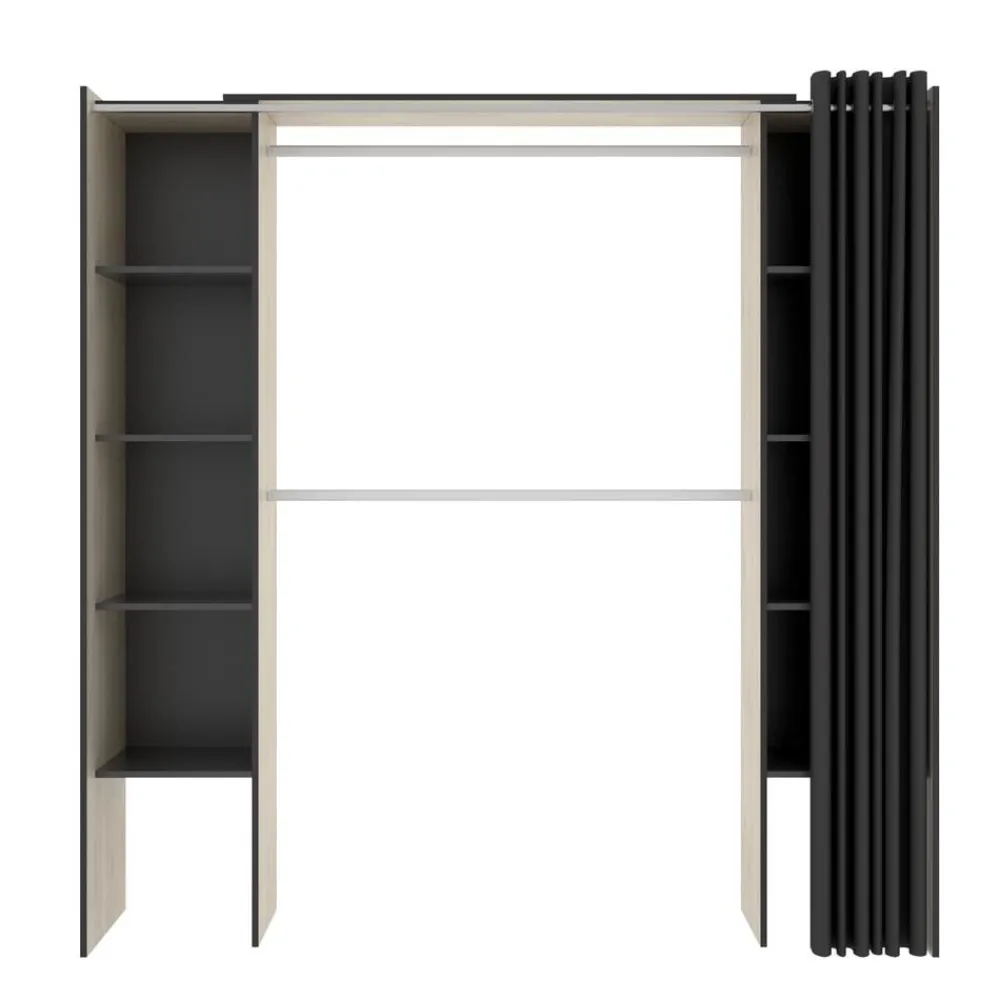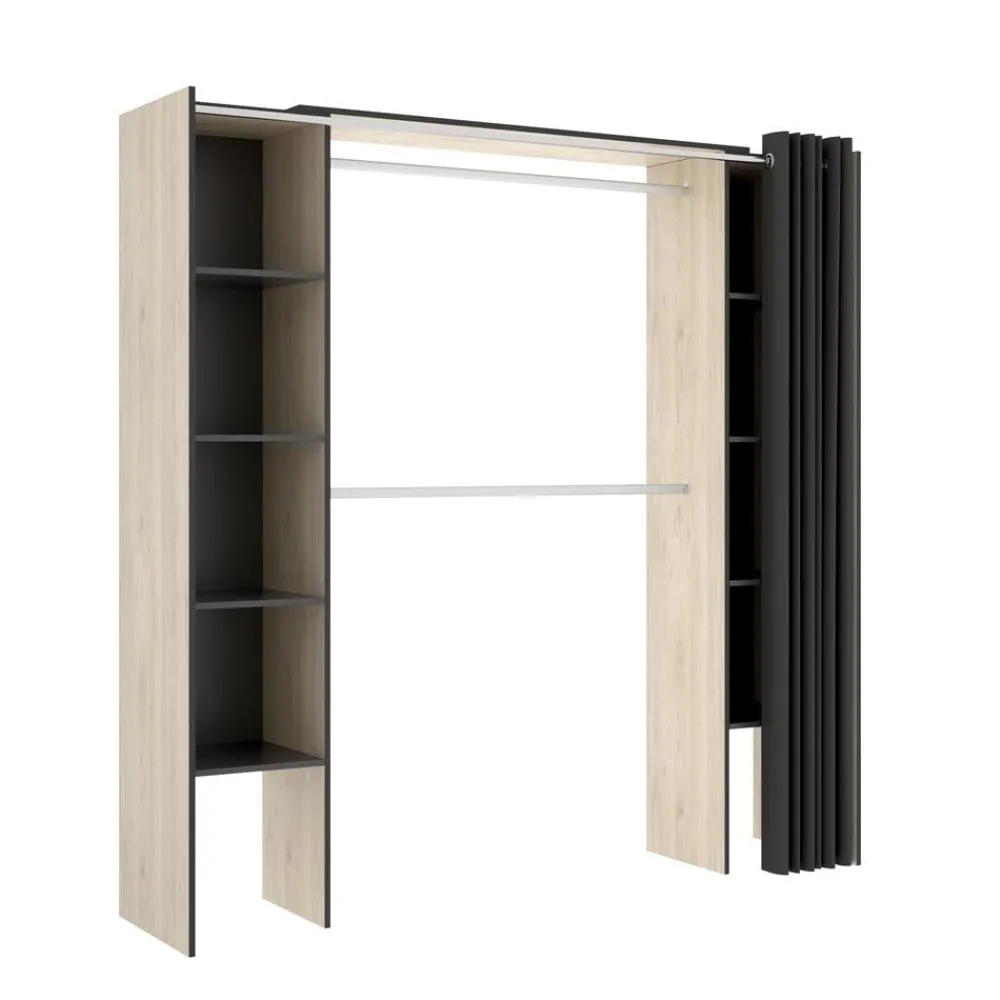 Armario vestidor sin puertas, está compuesto de 2 columnas con 4 estantes cada unas separadas por dos barras para colgar la ropa, puedes adaptarlo a la medida deseada entre 180 y 110 cm simplemente cortando las barras. Se presenta en un bonito acabado color natural combinado con grafito. Cuenta con una cortina en color grafito para cuando quieras que se vea la ropa.