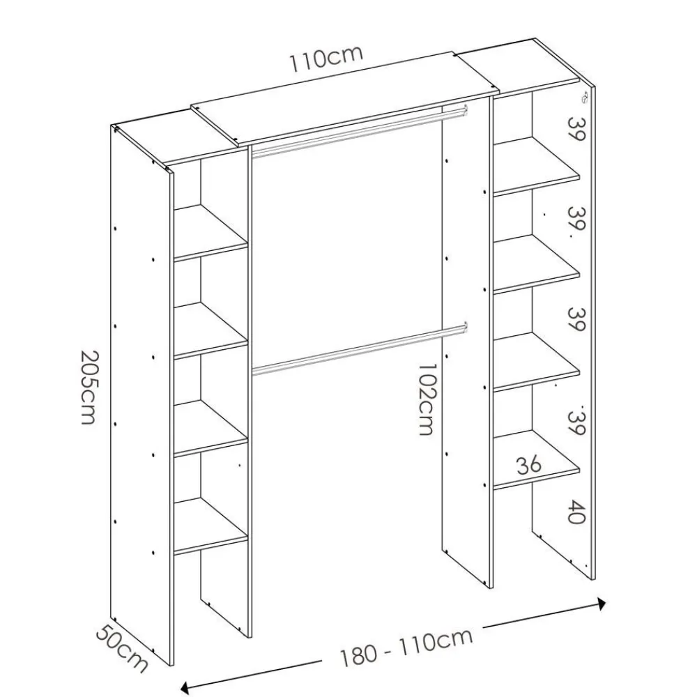 Un vestidor a medida de la pared en la que lo quieres acoplar, lo puedes montar con una anchura de 110 cm a 180 cm, compuesto de dos barras de colgar y dos columnas con estantes y cinco huecos para almacenar tus ropas bien dobladas.