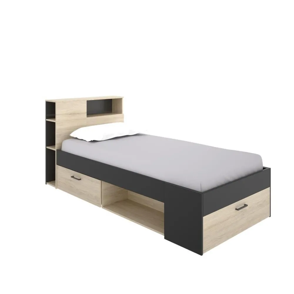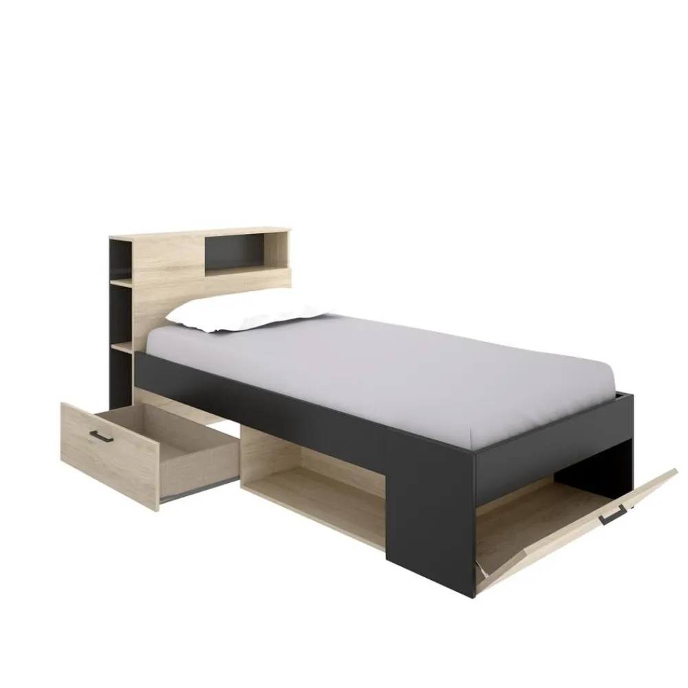 DEKIT Camas Baratas^Cama Compacta Con Cabecero Integrado Lanka Roble Natural – Grafito Con Un Cajón Y Puerta 99 X 96 X 218 Cm