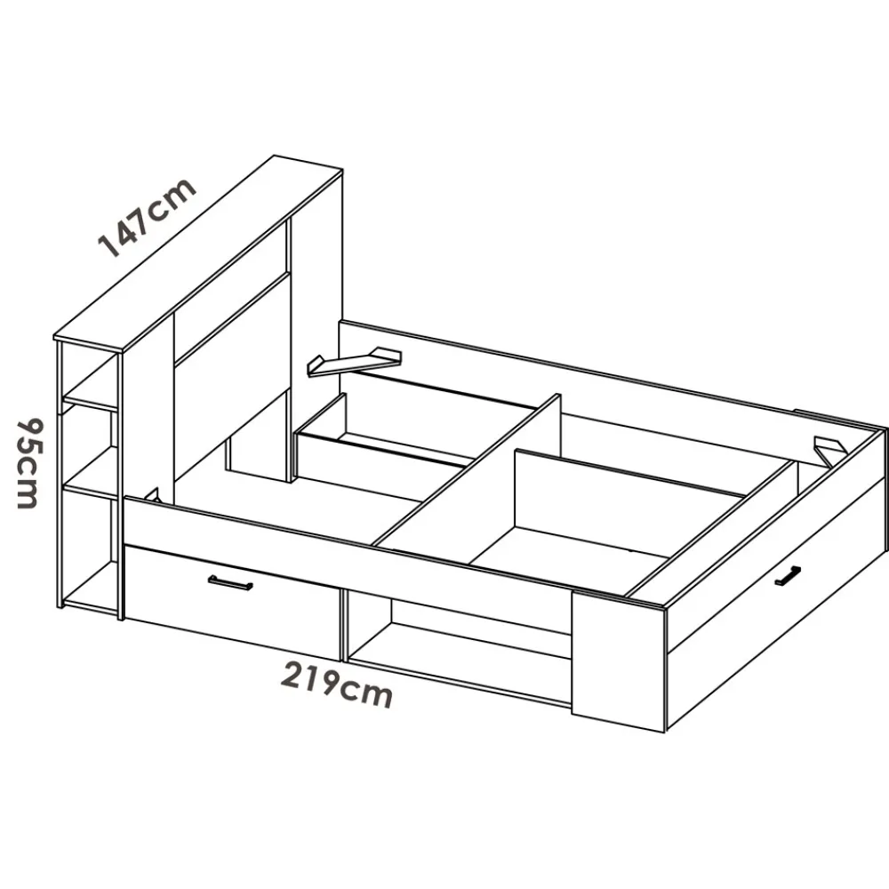 El cabecero dispone de una estantería en el lateral que nos permite colocar libros, en la parte frontal presenta un amplio hueco que hace las veces de mesilla de noche y así poder dejar el despertador o cualquier objeto personal que se necesite tener a mano, la parte superior del cabecero también tiene una amplia superficie dónde colocar una lámpara de noche o algún objeto decorativo. Debajo de la cama, en cada uno de los laterales, tenemos un amplio cajón y un hueco en el que podemos guardar la ropa de cama, mantas u otros artículos del hogar, manteniendo el dormitorio ordenado y funcional. Y para rematar esta cama con extra de almacenaje, también dispone en la parte baja un zapatero que ocupa todo el ancho de la cama, con una puerta abatible, tus zapatos estarán siempre bien ordenados.