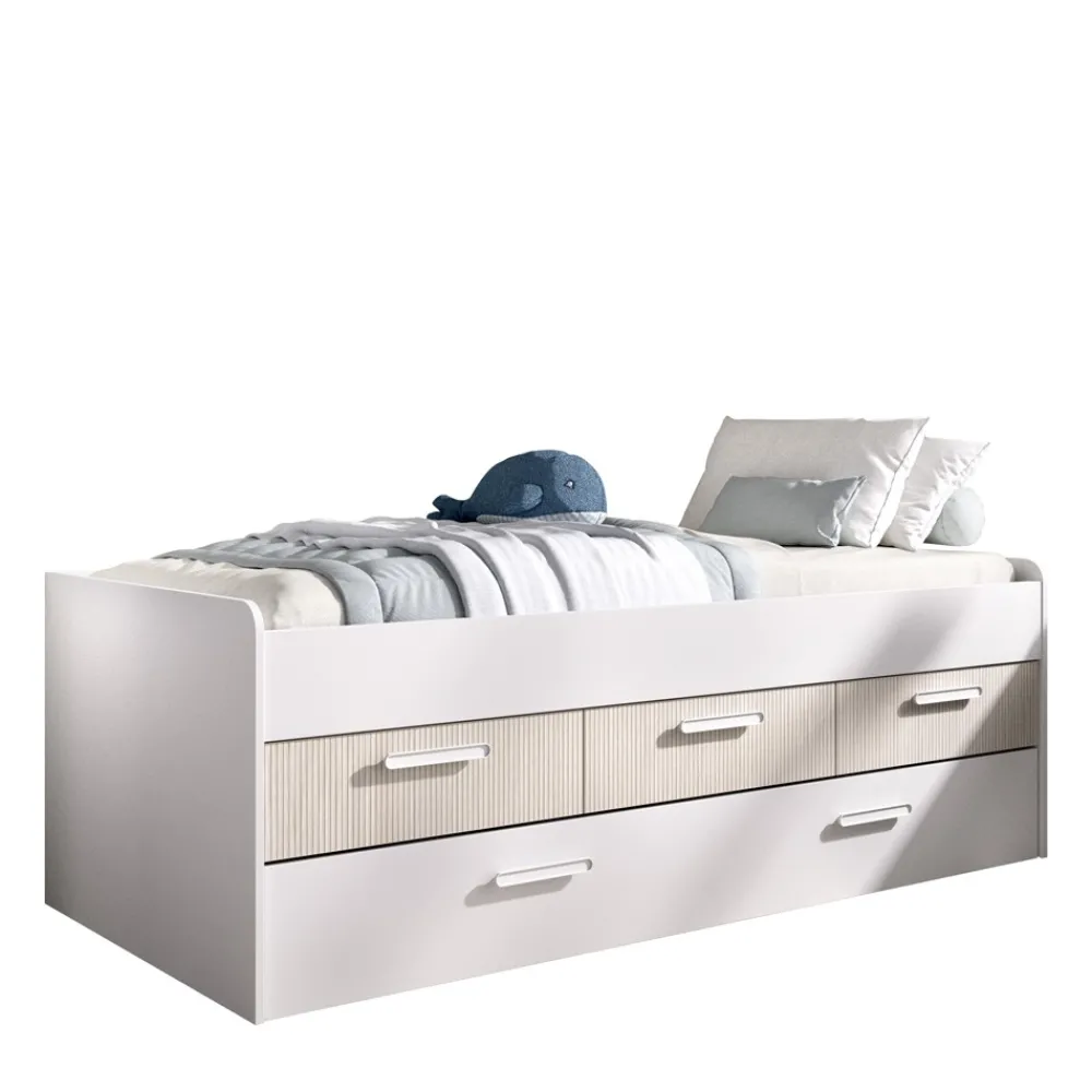 La es la solución perfecta para habitaciones pequeñas, ofreciendo un diseño moderno y funcional que se adapta a cualquier espacio. Esta cama compacta en color blanco y alistonado no solo maximiza el espacio de almacenamiento gracias a sus tres amplios cajones, sino que también cuenta con una cama de arrastre inferior, ideal para invitados o para las habitaciones infantiles.