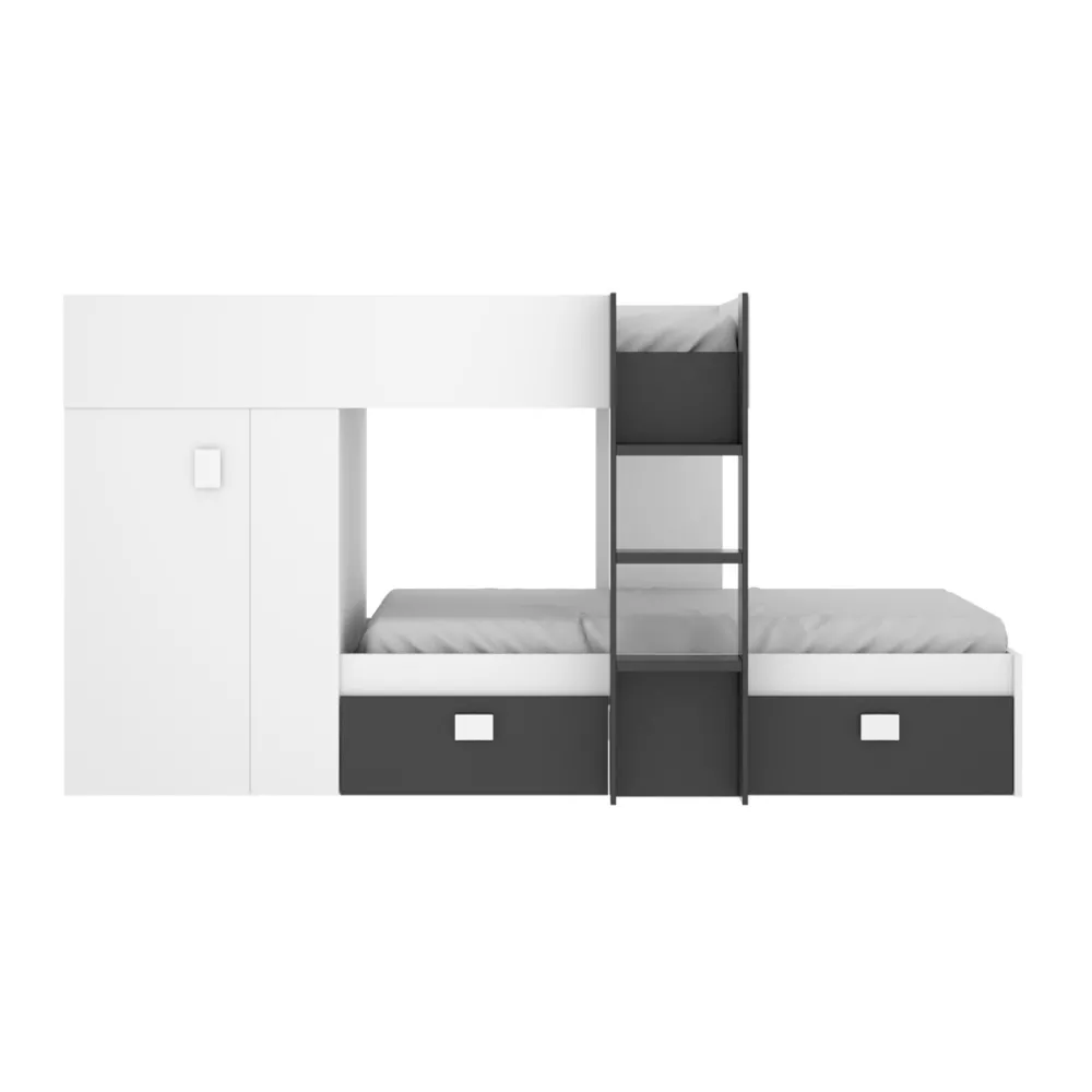 Si quieres conseguir el ahorro total tanto en espacio como en dinero, lo conseguirás al comprar la cama tren con armario juvenil Groe, diseño moderno en líneas rectas en color blanco y grafito que nos permite tener dos camas individuales en muy poco espacio en la habitación juvenil, un gran armario y dos cajones contenedores en la cama inferior.