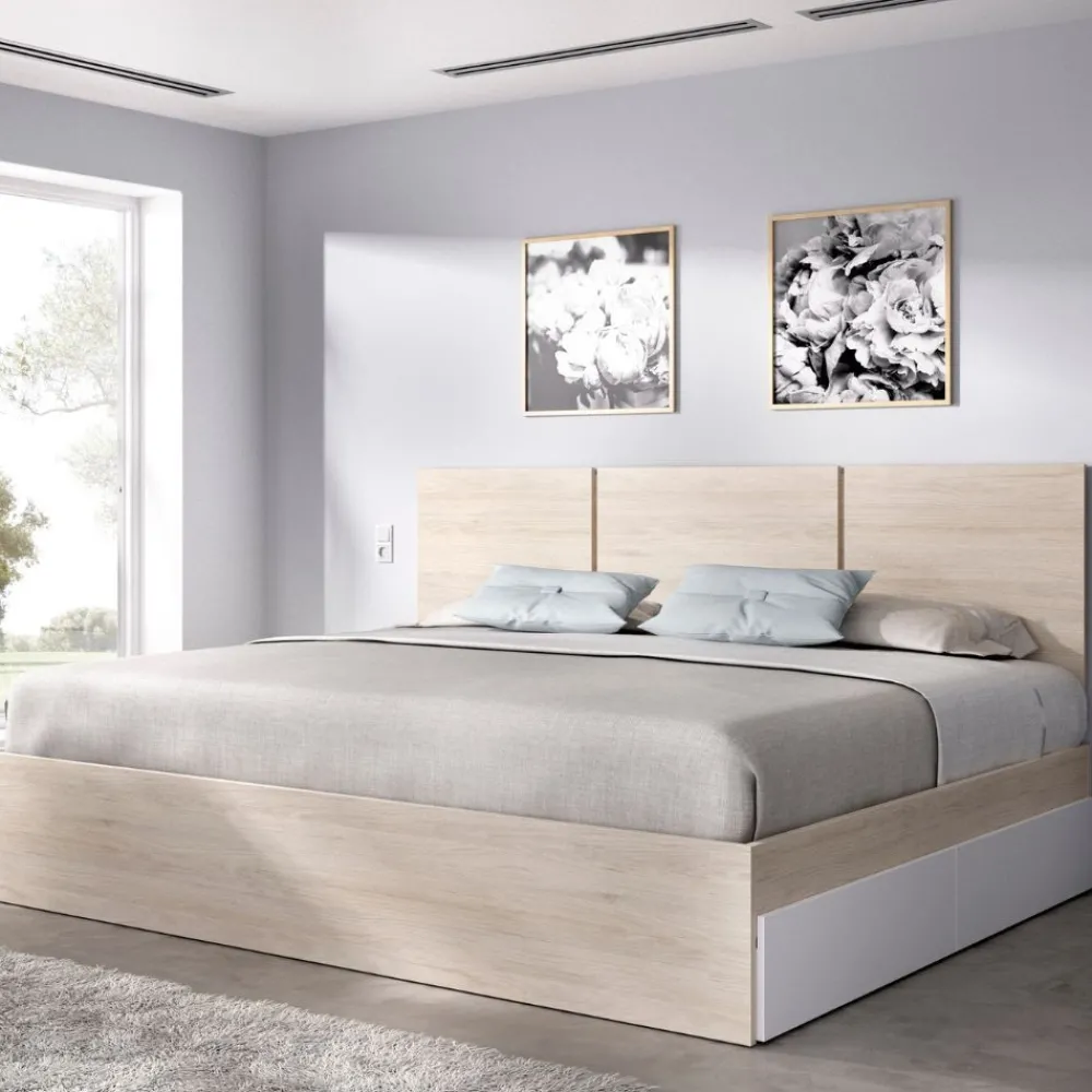 Estructura de cama con 4 cajones Havana, en color roble natural combinado con blanco en los frentes. Perfecta para añadir espacio de almacenamiento en tu habitación.