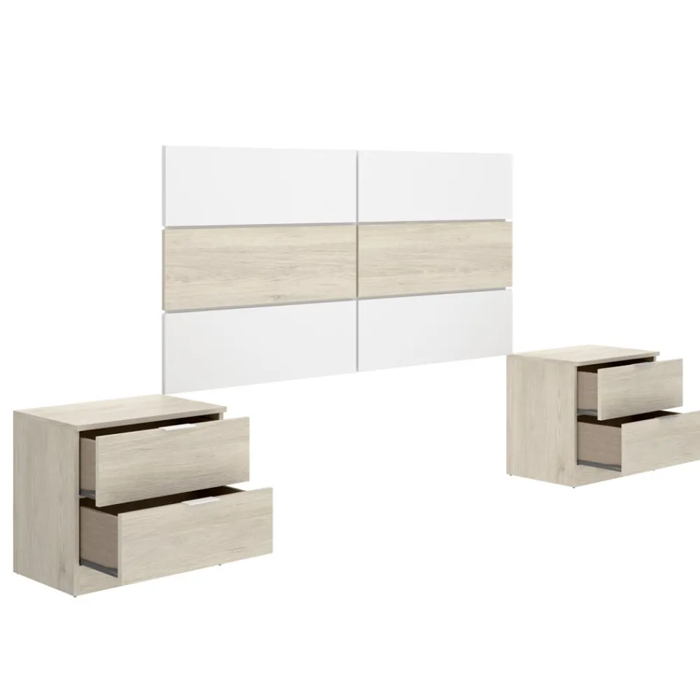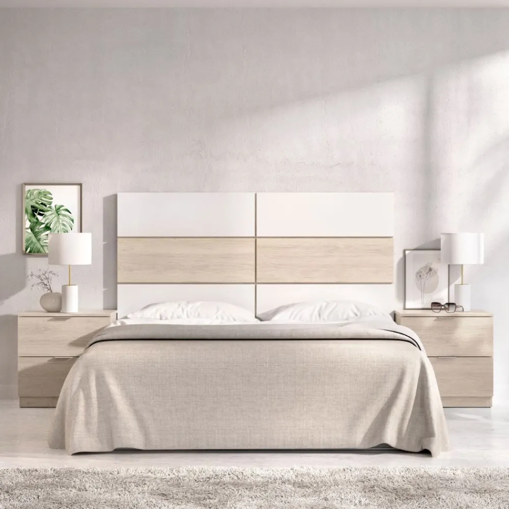 El conjunto es la opción ideal para aquellos que buscan una combinación perfecta de estilo moderno y funcionalidad. Diseñado en un elegante color blanco mate con detalles en roble natural, este cabecero aporta un toque de sofisticación y actualidad a cualquier dormitorio. Las dos mesitas de noche incluidas cuentan con dos cajones cada una, proporcionando un amplio espacio de almacenamiento para mantener tus objetos personales organizados y a mano.
