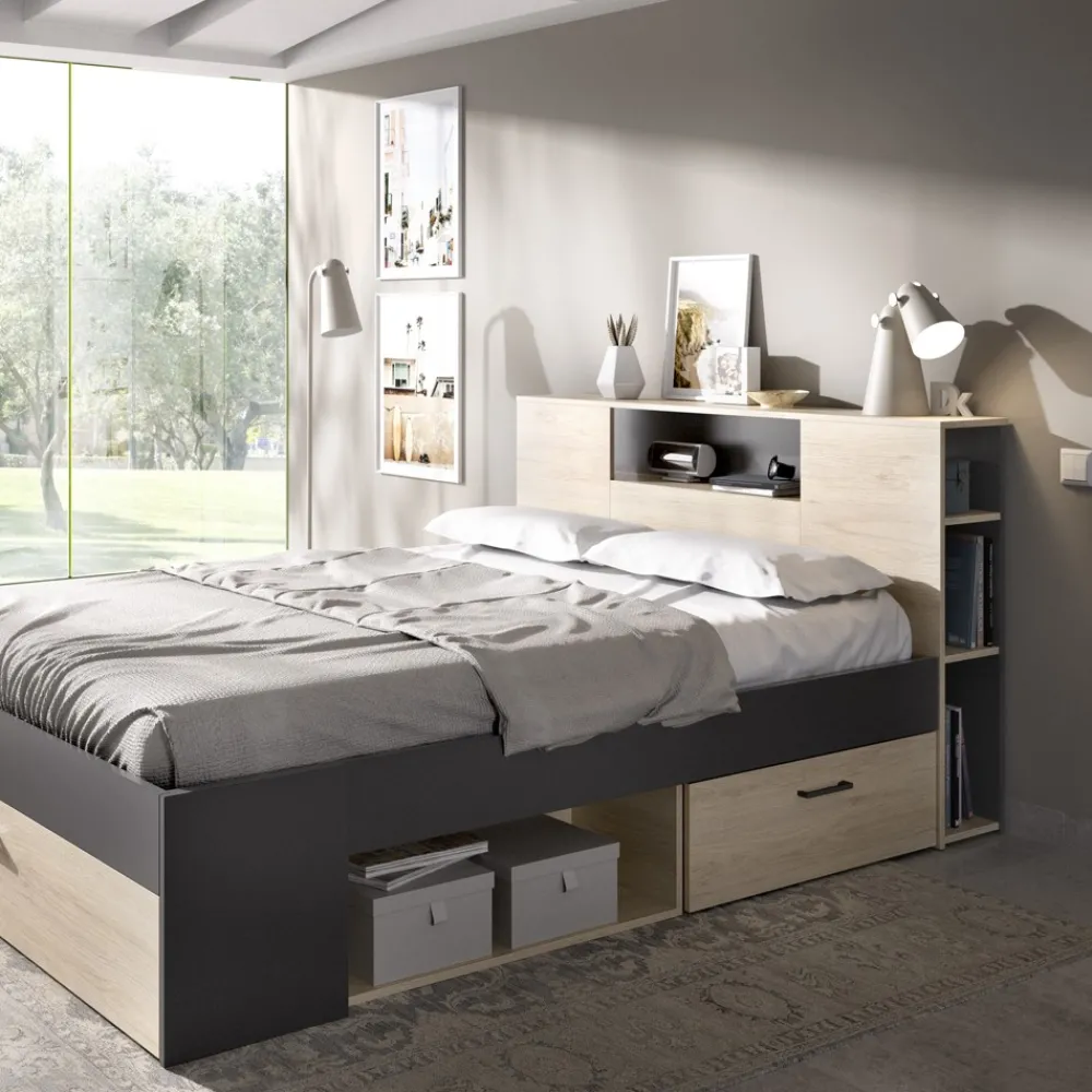 La es la solución ideal para habitaciones que necesitan maximizar el espacio disponible. Esta cama, diseñada en color roble natural combinado con grafito, no solo ahorra espacio al no requerir mesitas de noche, ya que van integradas en el cabecero, sino que también proporciona un amplio almacenamiento tanto en el cabecero como bajo la cama.