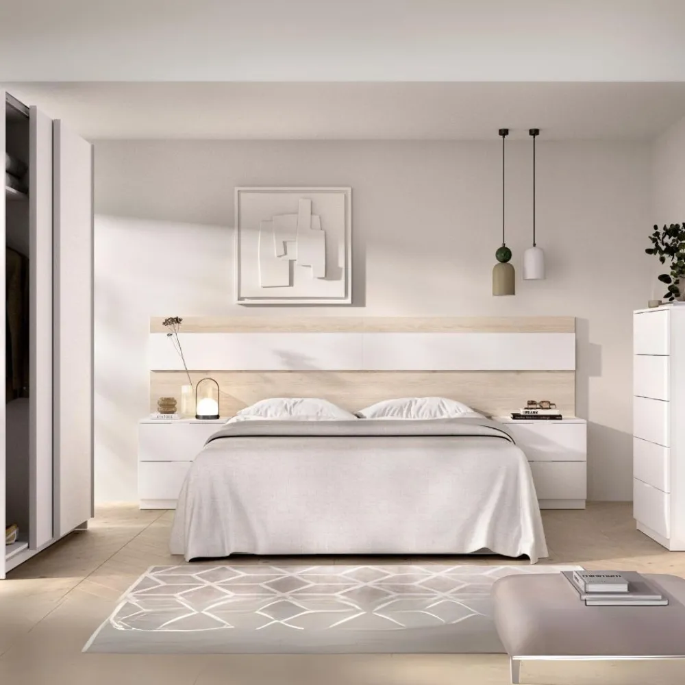 Dormitorio para habitación Niza, compuesto por un cabecero de cama con dos mesitas, un sinfonier de 5 cajones y un armario de 2 puertas correderas de 120 cm de ancho, en color blanco combinado con roble natural, es un conjunto que te ayudará a ahorrar dinero.