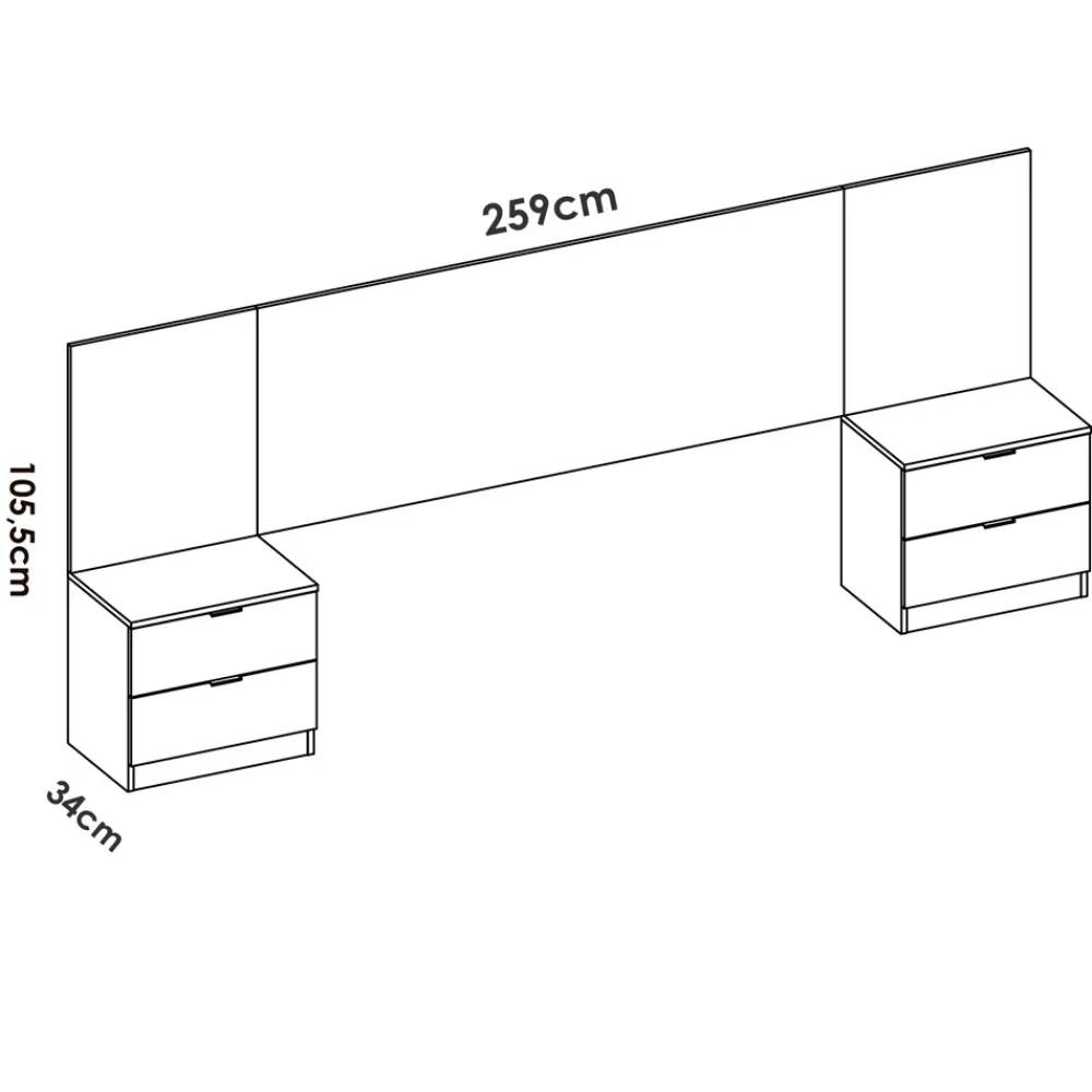 - Cabecero de cama con dos mesitas de noche: 258,8 cm (ancho) x 96 cm (alto) x 34,2 cm (fondo)
