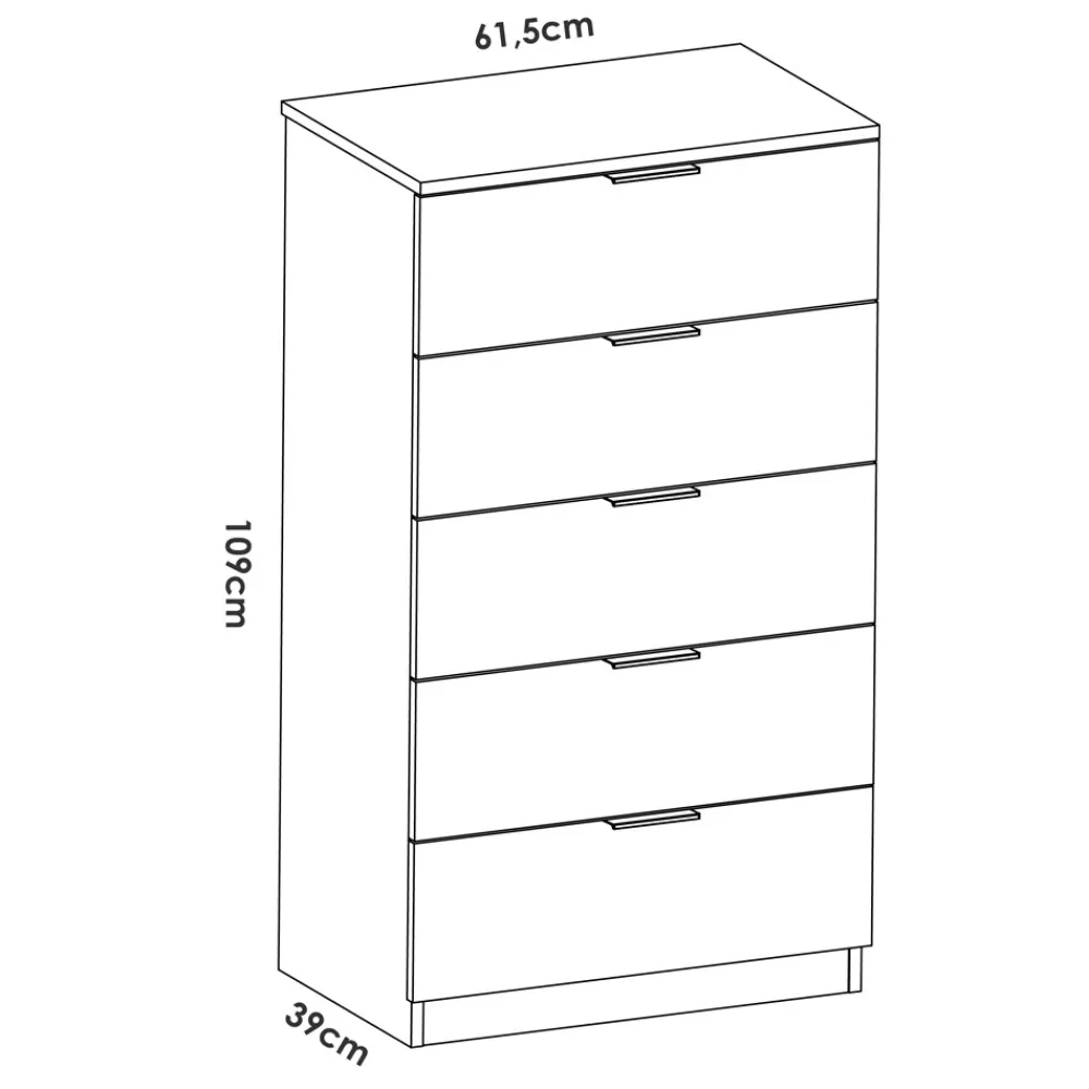El es la elección ideal para quienes desean una habitación moderna y elegante. Este set incluye un cabecero para cama con dos mesitas de noche y una cómoda alta de 5 cajones, proporcionando un amplio espacio de almacenamiento y un diseño estilizado.