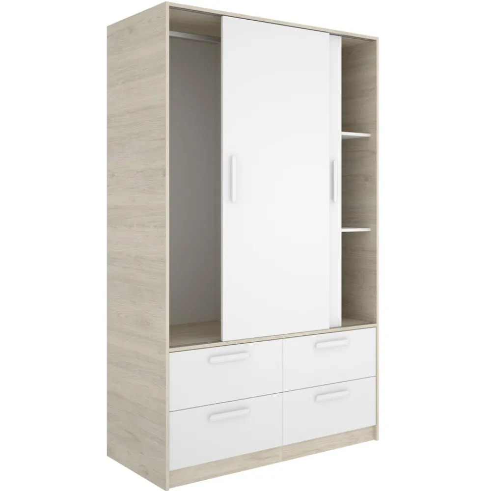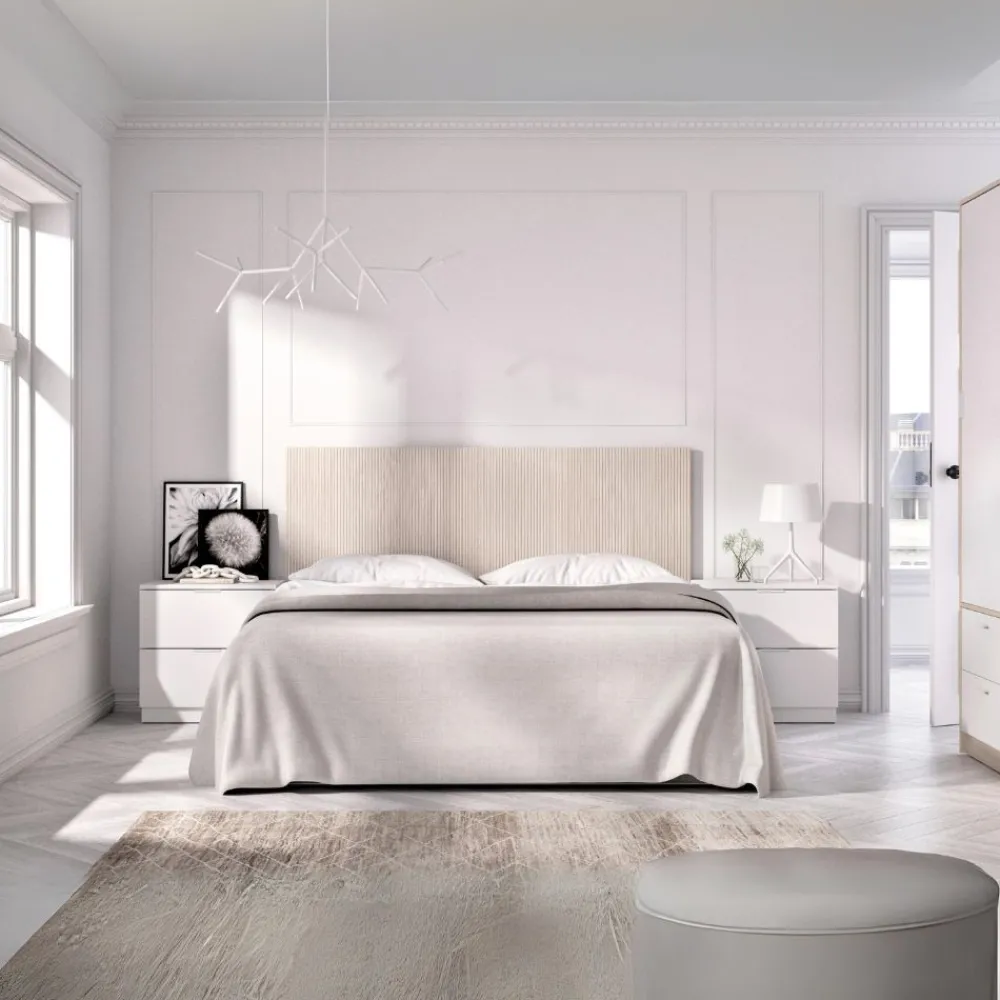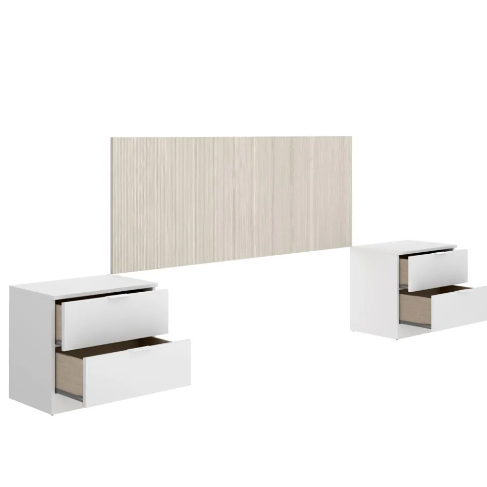Transforma tu dormitorio con el elegante conjunto Lusa: cabecero con 2 mesitas de noche y armario de 2 puertas correderas y 4 cajones. En color blanco y alistonado, ideal para un estilo moderno.