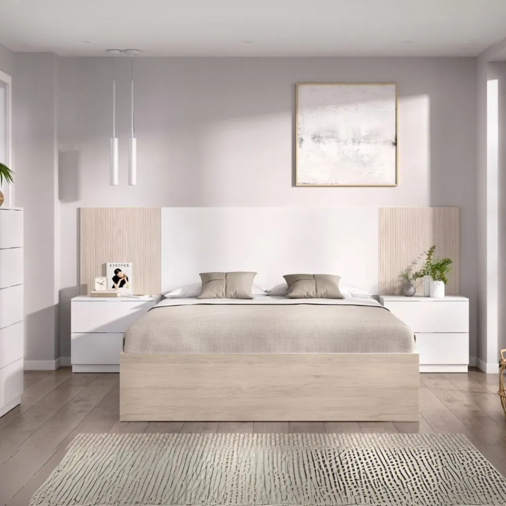 El cabecero, con su acabado en blanco mate y laterales alistonados, se convierte en el punto focal del dormitorio, mientras que las mesitas de noche y el sinfonier proporcionan un amplio espacio de almacenamiento. Las mesitas cuentan con dos cajones cada una, perfectos para guardar tus objetos personales y mantener tu espacio ordenado.