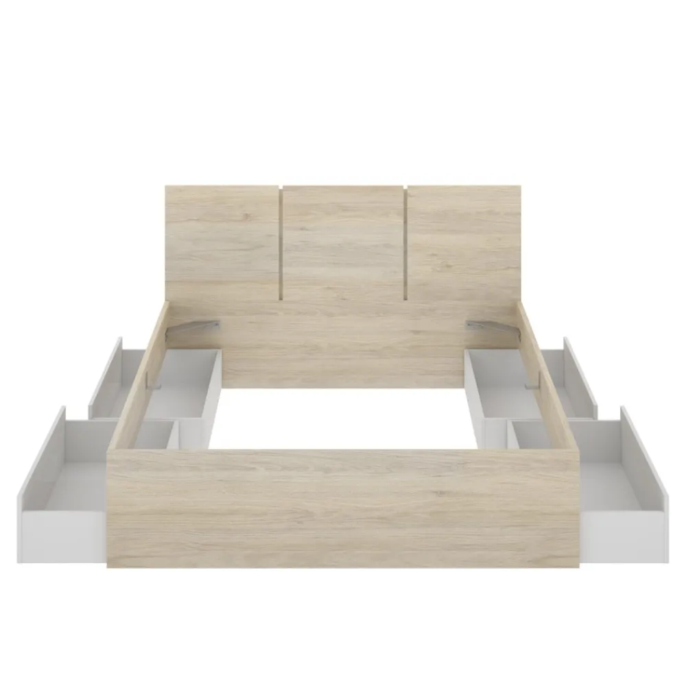 El conjunto de dormitorio Havana incluye una estructura de cama para colchón y somier de 135-140×190 cm con cuatro cajones grandes y un sinfonier en color natural y blanco, ideal para cualquier estilo de habitación.