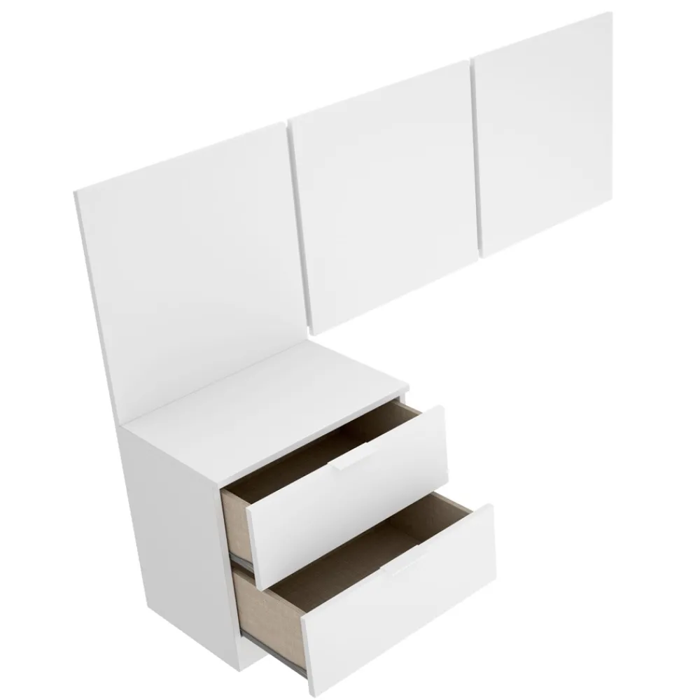 Fabricado en melamina de alta calidad, este conjunto garantiza durabilidad y resistencia. Los cajones cuentan con guías metálicas de suave deslizamiento, y los tacos ABS en las patas del mobiliario previenen ruidos y rayaduras en el suelo.