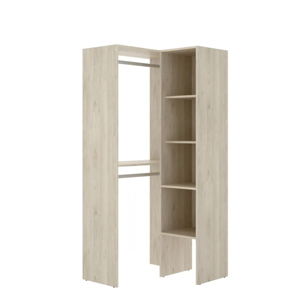 El armario rincón sin puertas es la solución perfecta para maximizar el almacenamiento en el dormitorio. Con su diseño compacto y espacioso, ofrece un amplio espacio para colgar ropa y guardar otros objetos. Su acabado en color roble natural combina perfectamente con la cama y el escritorio, creando una armonía visual en la habitación.