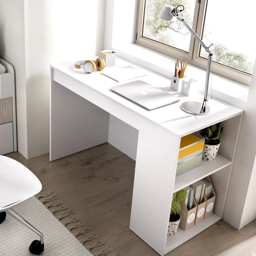 La mesa escritorio Teo es esencial para crear un área de estudio funcional y organizada. Con su amplio espacio de trabajo, cajón y estante, proporciona todo lo necesario para mantener el área de estudio ordenada y libre de desorden. Su diseño compacto y elegante en blanco se adapta perfectamente a cualquier rincón del dormitorio.