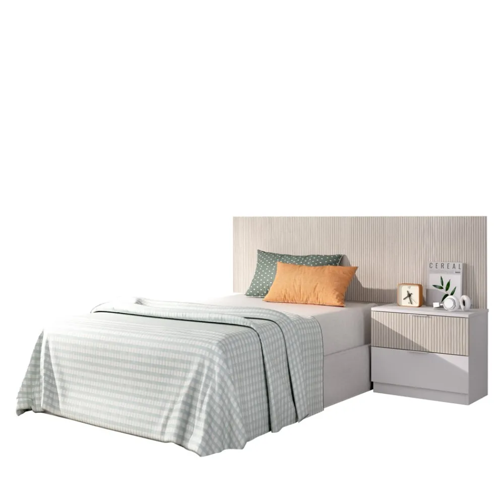El es una solución ideal para quienes buscan dar un toque diferente al dormitorio juvenil. Diseñado especialmente para camas individuales de 90 cm, este conjunto combina un cabecero mural con una mesita de noche de 2 cajones, perfecta para mantener el dormitorio ordenado y con un toque de diseño. El cabecero, con una altura de 60 cm, además de proteger la pared de roces, permite apoyarse cómodamente con un cojín para leer o ver la televisión desde la cama.