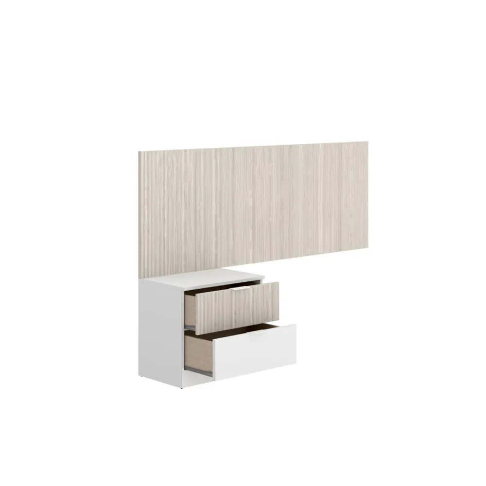 Cabecero para cama de 90 cm Lion con una mesita de noche de 2 cajones, en color alistonado combinado con blanco. El cabezal colgante es perfecto para camas individuales, protegiendo la pared de los roces, la mesita es ideal para colocar una lámpara de noche o despertador.