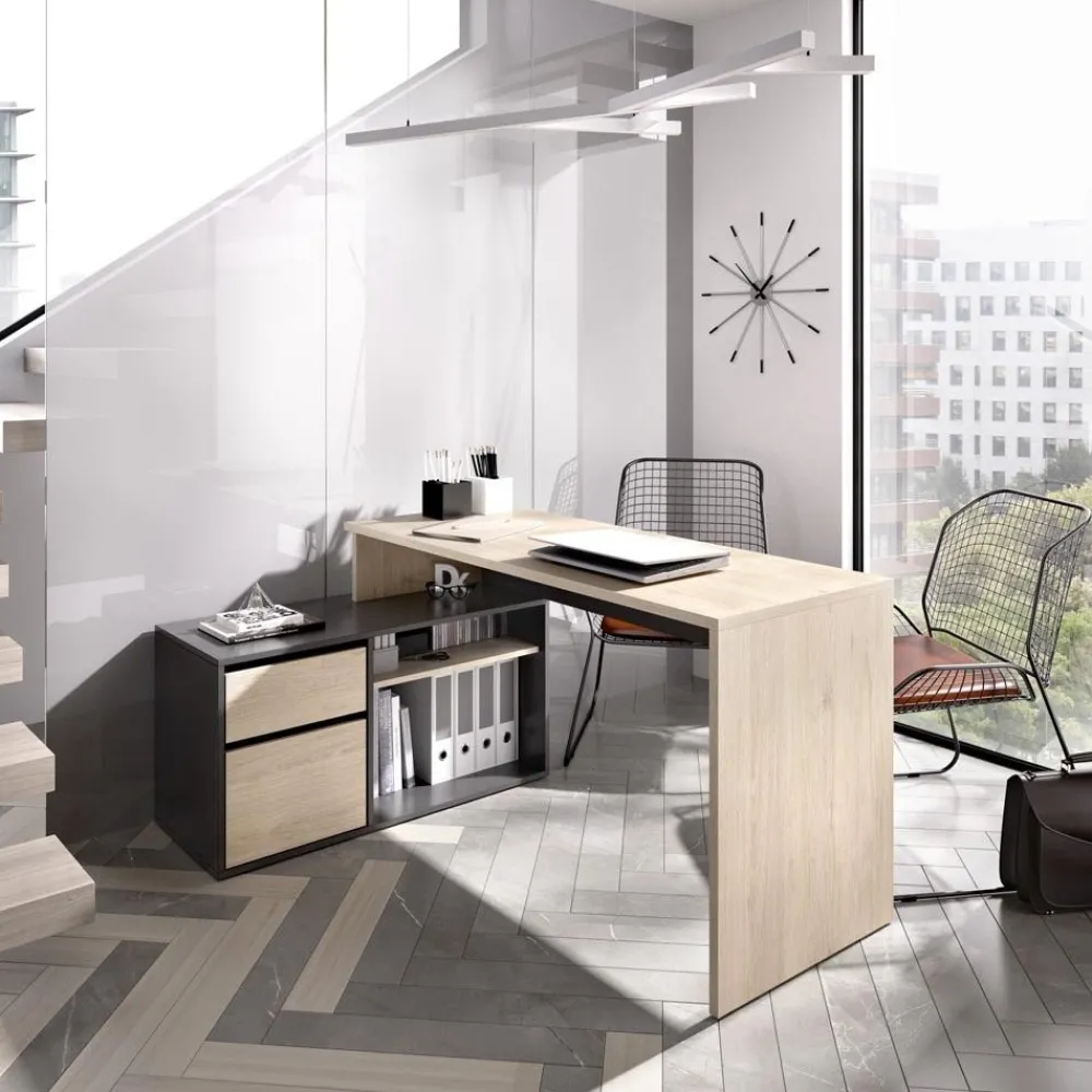 Escritorio rincón Rox en color natural combinado con grafito, se puede montar en forma de “L”. Dispone de una cajonera y librería incorporada. Montaje reversible, puedes colocar el mueble indistintamente a derecha o izquierda. Una mesa de oficina con un precio increíble. Su acabado en colores de estilo nórdico que aporta un toque escandinavo a tu zona de trabajo. También se puede instalar como un escritorio tradicional. Tienes 4 posiciones de montaje