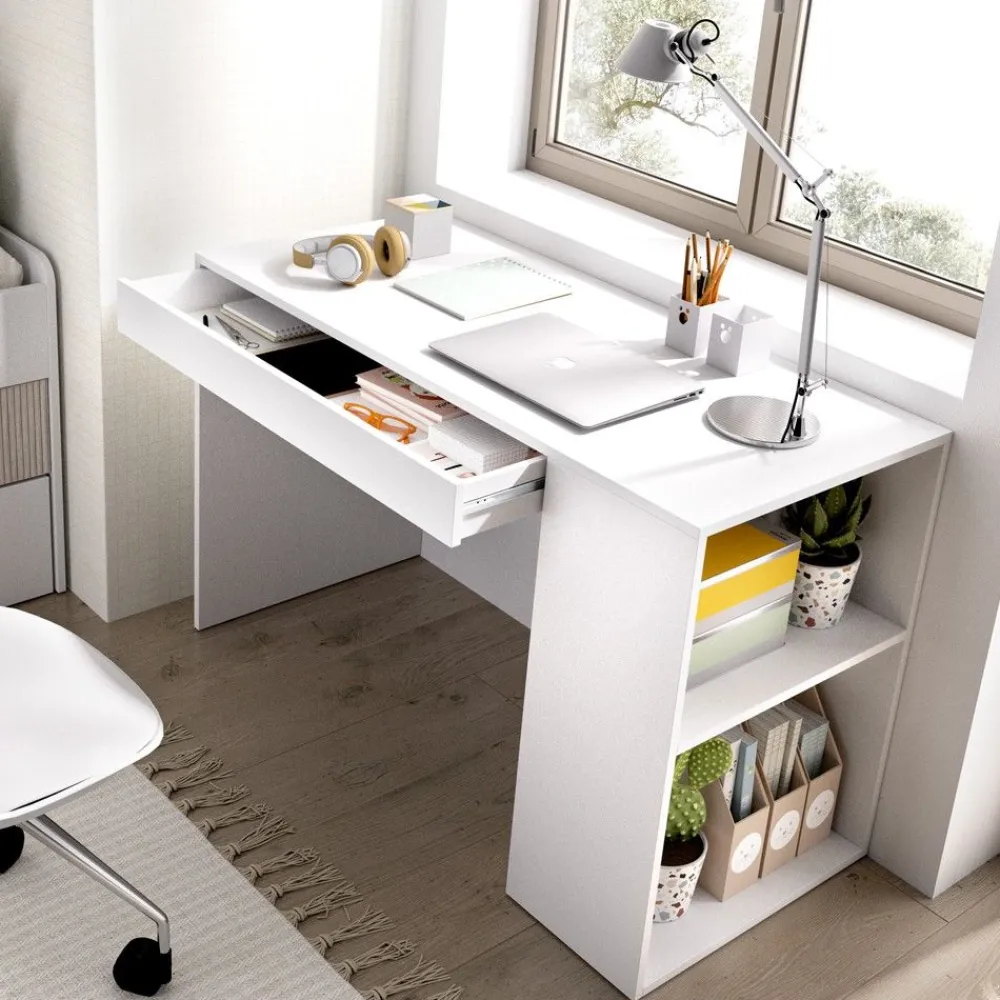 La mesa de escritorio Teo de 115 cm de ancho en color blanco es la mejor solución para amueblar la habitación juvenil. Este escritorio combina diseño con la capacidad de almacenaje que ofrece su estantería lateral y su cajón, perfecta para estudiar o trabajar en casa.